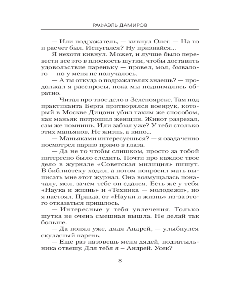 💳 Оплатить за товар можно при получении 🇰🇿 Есть бесплатная доставка по Казахстану от 1 дня 🎁 Копите бонусы с каждой покупки Серия: Фантастический боевик. Новая эра 1986 год. В Новоульяновске находят жуткий труп — мужчину без головы, привязанного к дереву. Без единой капли крови, без следов борьбы. Опытный оперативник Андрей Петров по прозвищу Курсант сразу понимает: это не просто убийство, это чей-то тщательно продуманный ритуал. Когда в городе начинают находить новые тела — уже без руки, ноги или других частей, становится ясно, что действует серийный убийца. В оперативных сводках его называют Мясником, а местные шепчутся, что такого зверя здесь еще не было. Петров уверен: убийца хитер, расчетлив и знает, как прятать следы. Остается только один вопрос: кто станет следующей жертвой? В погоне за маньяком Петрову придется столкнуться с бандитами, продажными чиновниками и своими собственными призраками прошлого. Он уже видел смерть слишком близко, но еще никогда не чувствовал ее дыхания так отчетливо. |
