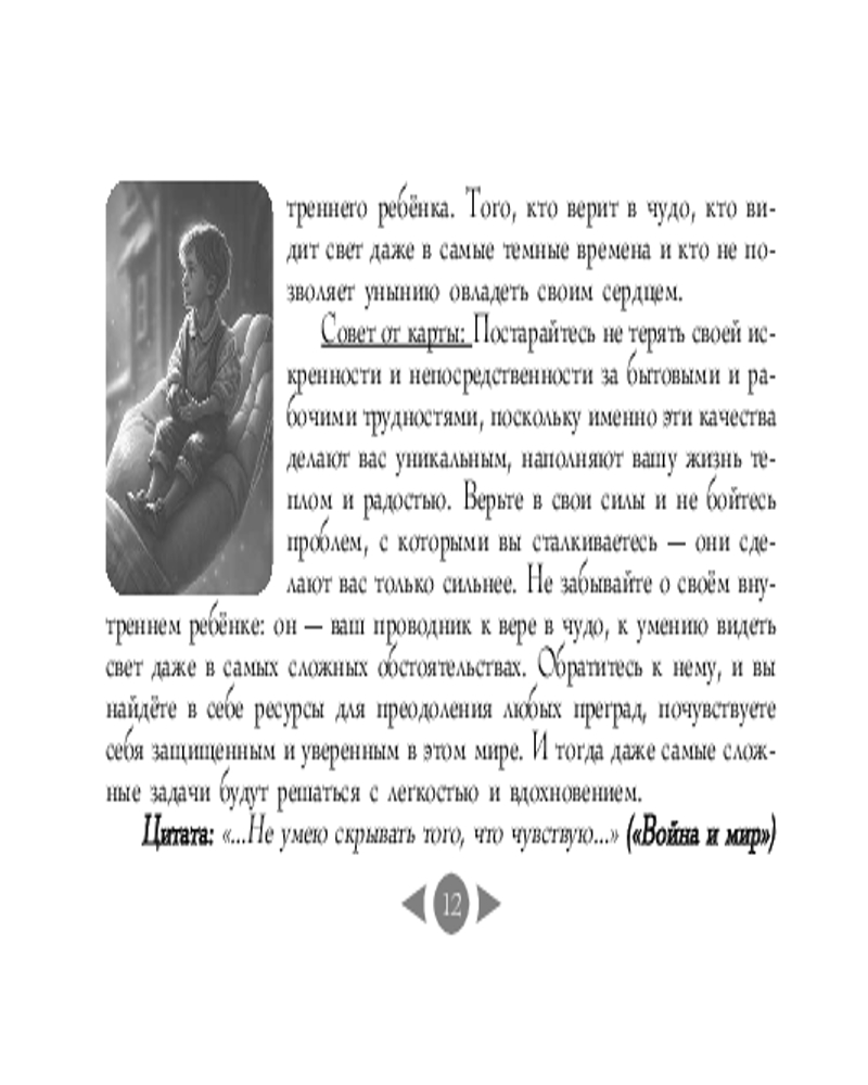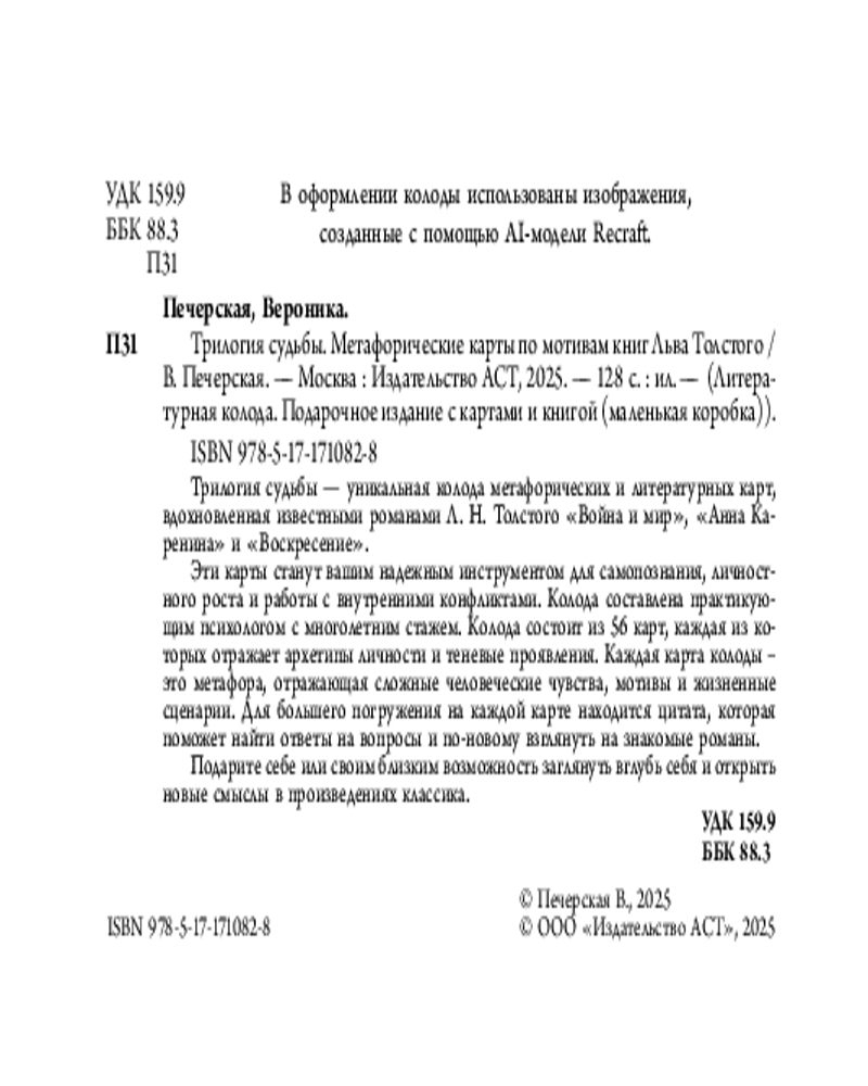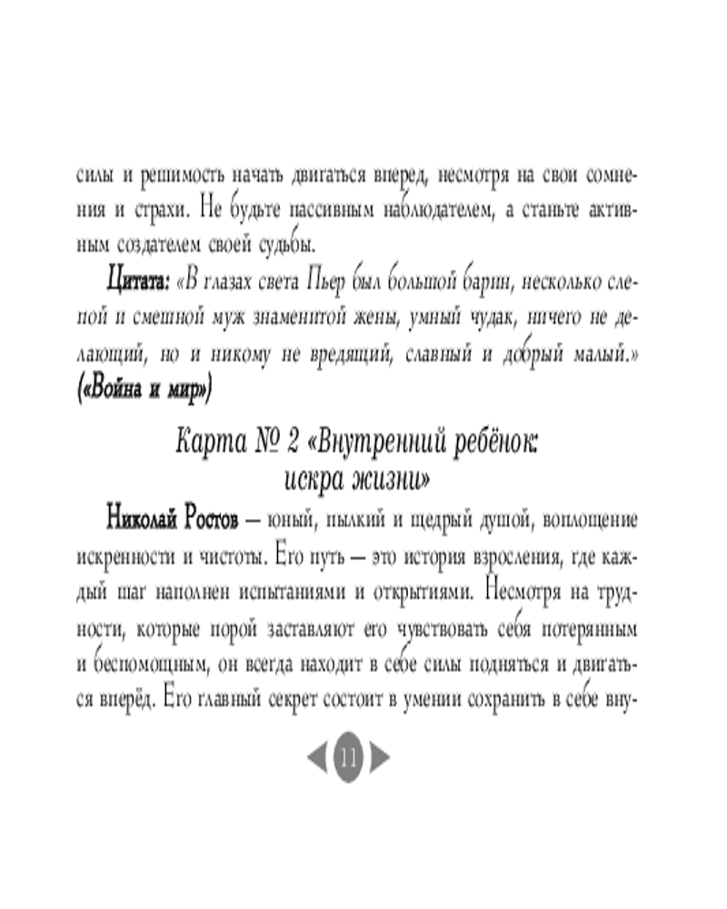 💳 Оплатить за товар можно при получении 🇰🇿 Есть бесплатная доставка по Казахстану от 1 дня 🎁 Копите бонусы с каждой покупки Серия: Литературная карманная колода (маленькая коробка) «Трилогия судьбы» — уникальная колода метафорических и литературных карт, вдохновленная известными романами Л. Н. Толстого «Война и мир», «Анна Каренина» и «Воскресение». Эти карты станут вашим надежным инструментом для самопознания, личностного роста и работы с внутренними конфликтами. Колода составлена практикующим психологом с многолетним стажем. Колода состоит из 56 карт, каждая из которых отражает архетипы личности и теневые проявления. Каждая карта колоды – это метафора, отражающая сложные человеческие чувства, мотивы и жизненные сценарии. Для большего погружения на каждой карте находится цитата, которая поможет найти ответы на вопросы и по-новому взглянуть на знакомые романы. Подарите себе или своим близким возможность заглянуть вглубь себя и открыть новые смыслы в произведениях классика. |