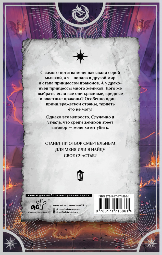 💳 Оплатить за товар можно при получении 🇰🇿 Есть бесплатная доставка по Казахстану от 1 дня 🎁 Копите бонусы с каждой покупки Серия: Любовь внеземная С самого детства меня называли серой мышкой, а я... попала в другой мир и стала принцессой драконов. А у драконьей принцессы много женихов. Кого же выбрать, если все они красивые, вредные и властные драконы? Особенно один — принц вражеской страны, терпеть его не могу! Однако всё непросто. Случайно я узнала, что среди женихов зреет заговор — меня хотят убить. Станет ли отбор смертельным для меня, или я найду свое счастье? |