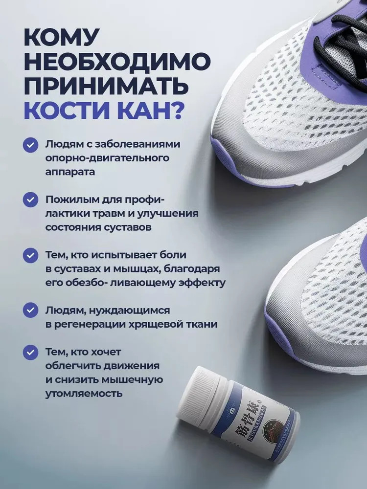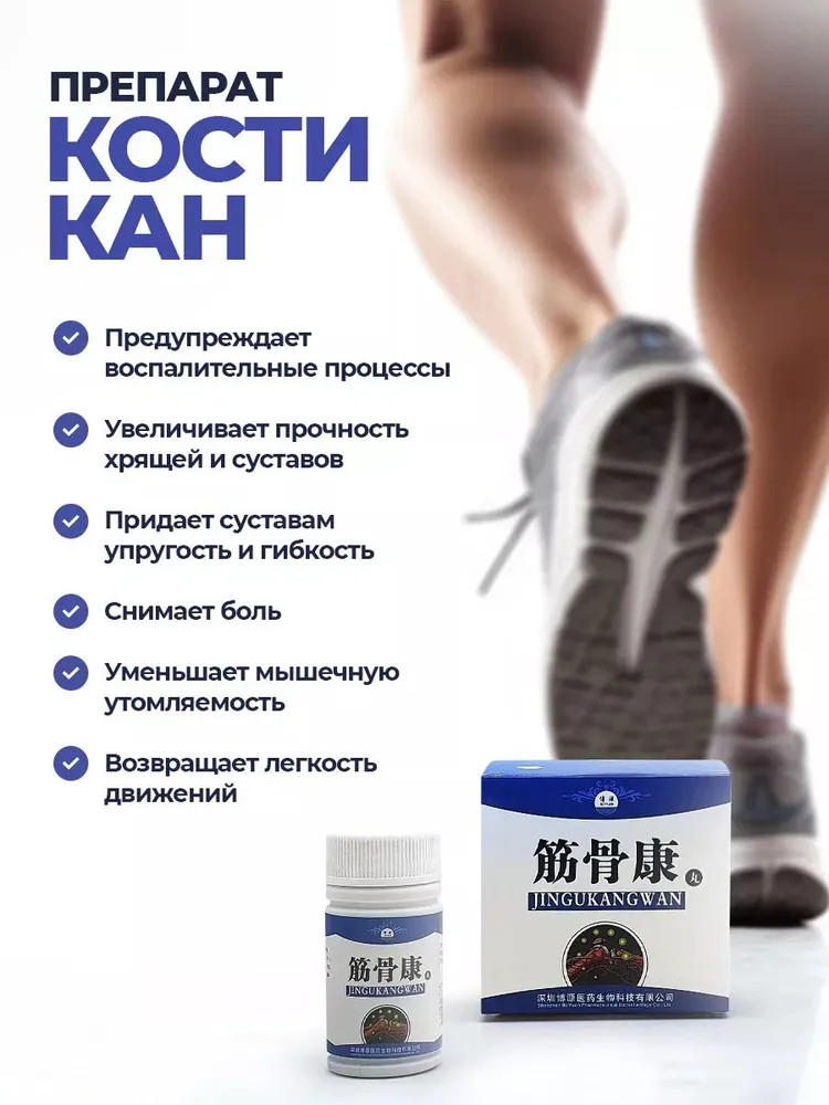 Кости Кан — натуральный препарат китайской медицины для профилактики и эффективного устранения воспалительных заболеваний мышечной и суставной ткани. Обладает высокой способностью регенерации деформированной хрящевой ткани. Активизирует выработку суставной жидкости, нормализует ее смазочные свойства. Предупреждает дегенерацию и воспалительные процессы, увеличивает прочность хрящей и суставов, придает им упругость и гибкость, снимает боль, уменьшает мышечную утомляемость и возвращает легкость движений.