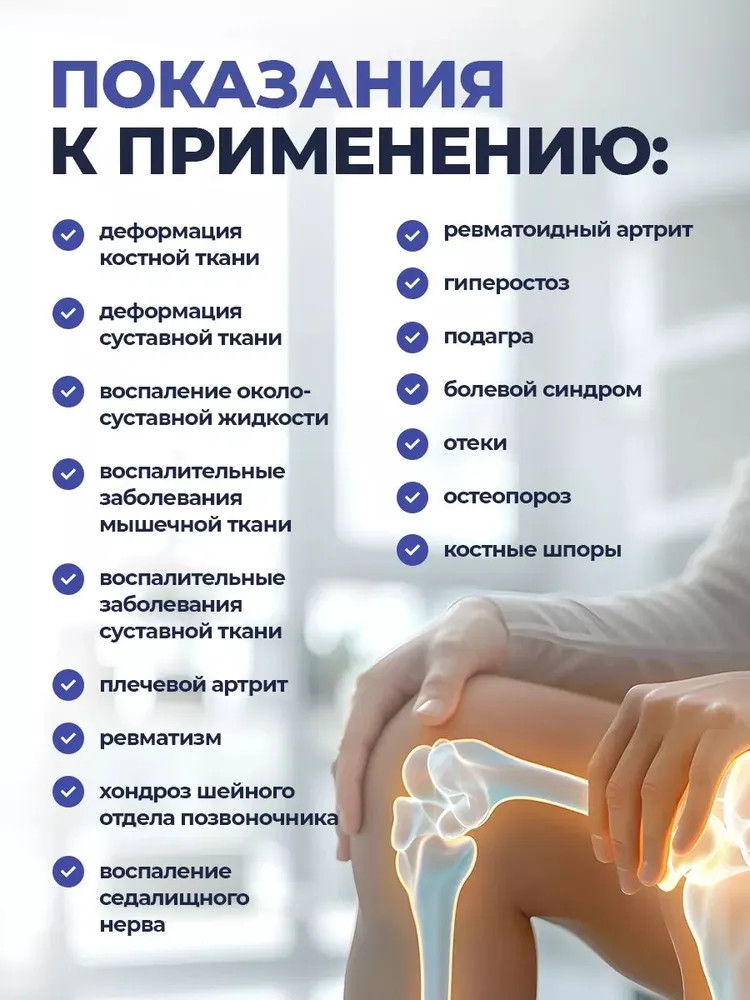 Показания к применению: деформация суставных тканей, воспалительные заболевания суставных и мышечных тканей, воспаление околосуставной жидкости, деформация костной ткани, плечевой артрит, хондроз шейного отдела позвоночника, ревматизм, воспаление седалищного нерва, гиперостоз, ревматоидный артрит, подагра, отеки, болевой синдром, костные шпоры, остеопороз.