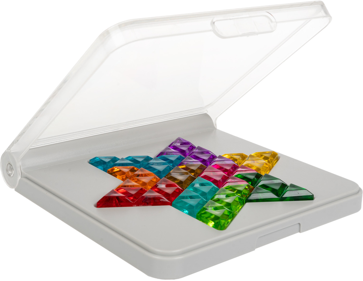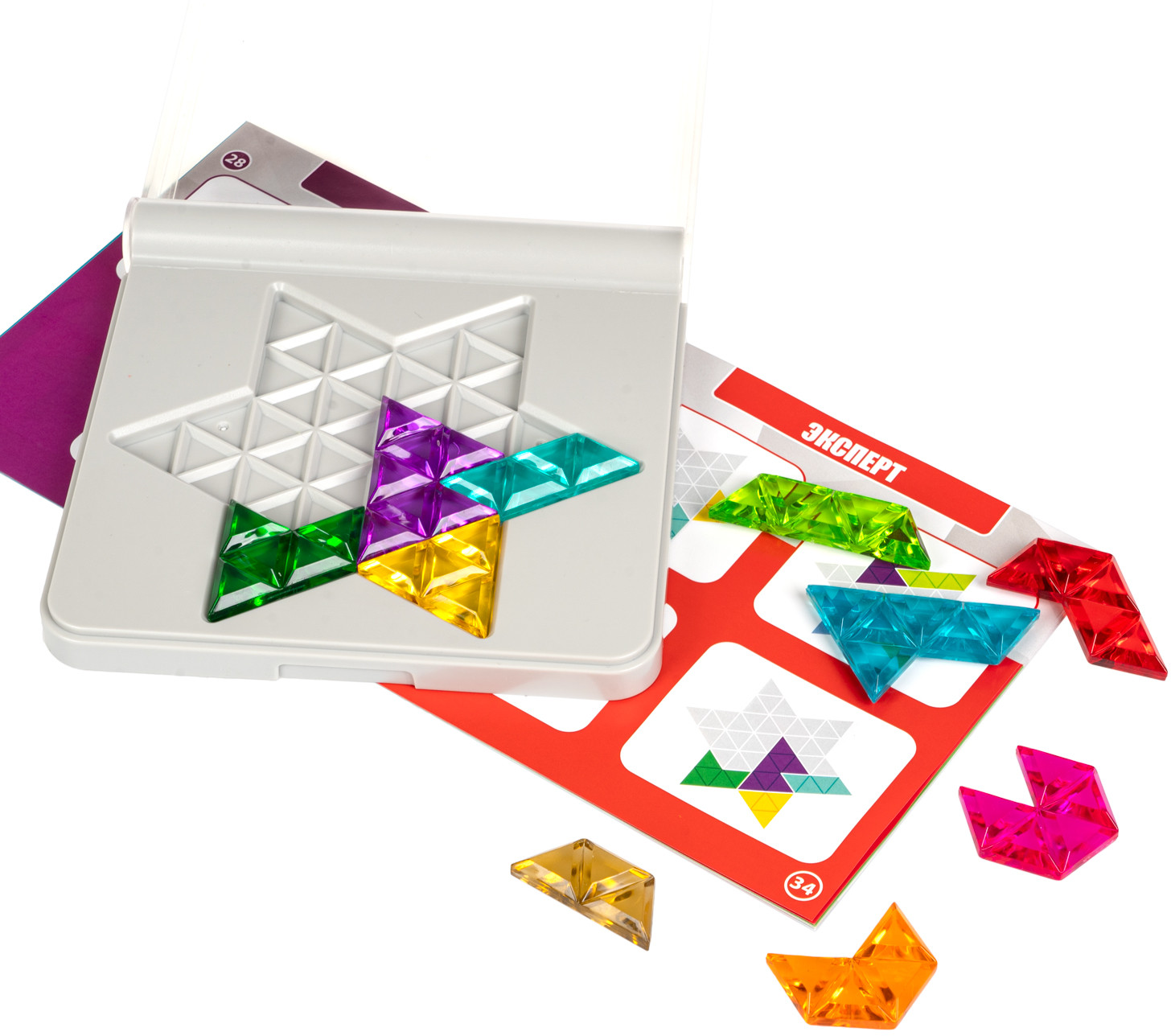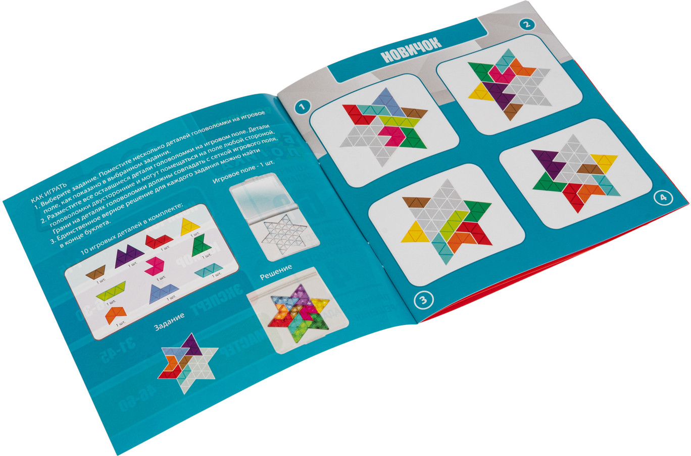 В комплект игры входят: удобное игровое поле с откидной крышкой, 10 игровых деталей, буклет с правилами, заданиями и решениями.