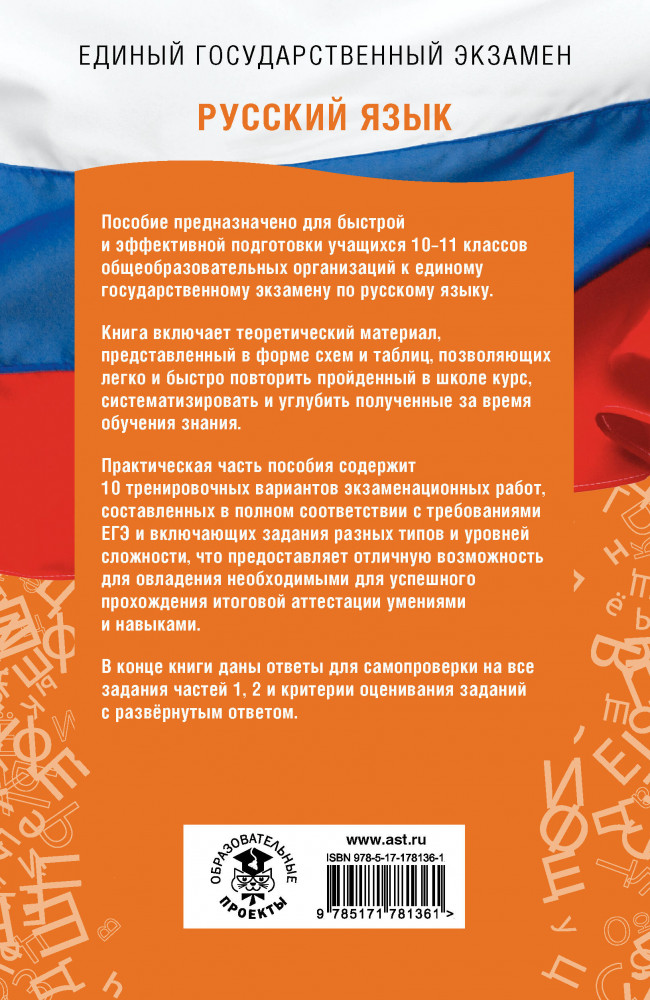 💳 Оплатить за товар можно при получении 🇰🇿 Есть бесплатная доставка по Казахстану от 1 дня 🎁 Копите бонусы с каждой покупки Серия: ЕГЭ на 100 баллов Пособие предназначено для быстрой и эффективной подготовки учащихся 10–11 классов общеобразовательных организаций к единому государственному экзамену по русскому языку. Книга включает теоретический материал, представленный в форме схем и таблиц, позволяющих легко и быстро повторить пройденный в школе курс, систематизировать и углубить полученные за время обучения знания. |
