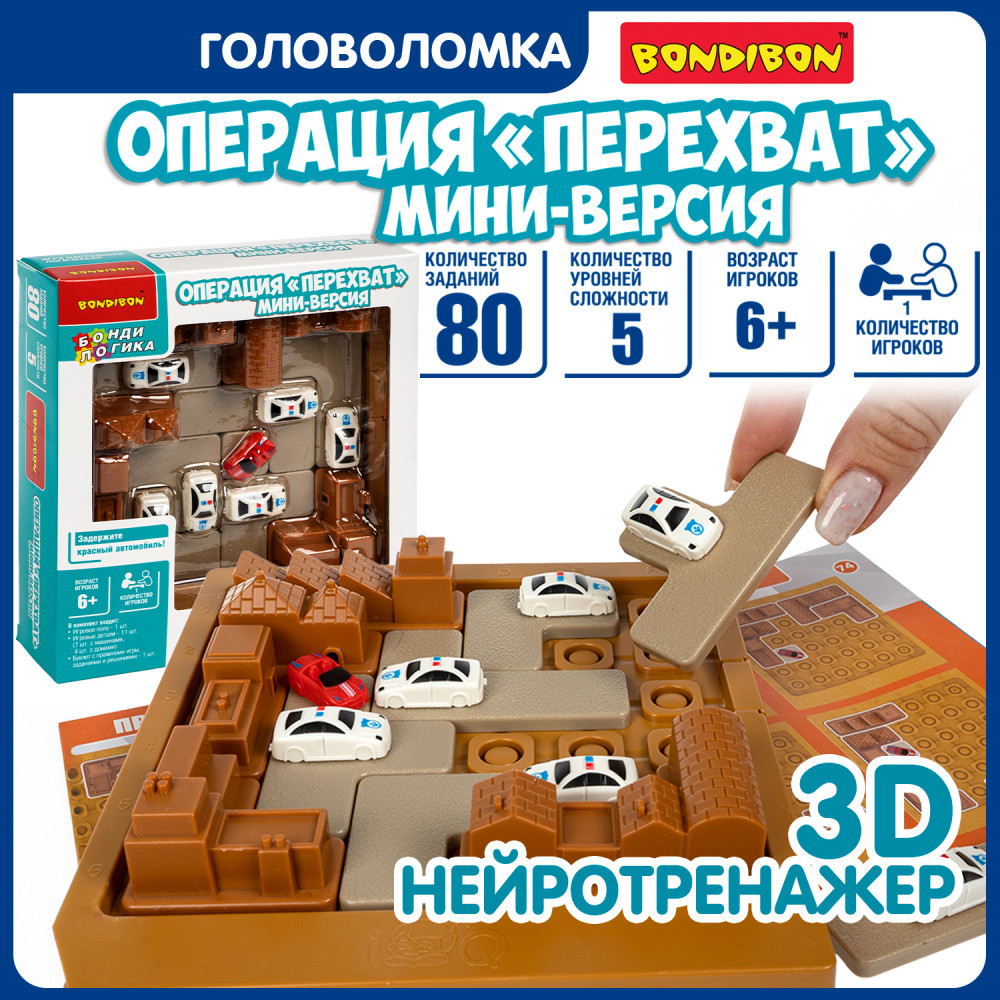 Настольная логическая игра головоломка «Операция перехват» мини-версия серии БондиЛогика от Bondibon понравится юным полицейским! Используйте свой ум, чтобы задержать красный автомобиль. Выберите одно из 80 заданий. Расположите красную машину и дома на игровом поле указанным образом — эти детали переставлять больше нельзя. Расставьте 6 деталей с полицейскими машинами на игровом поле так, чтобы заблокировать красное авто. Если все возможности выезда перекрыты — Вы нашли верное решение! Постепенно переходите на более сложные уровни.