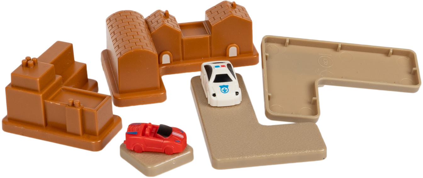 В набор входят: игровое поле 15×16 см, 11 игровых деталей (7 деталей с машинами, 4 детали с домами), буклет с правилами игры, заданиями и решениями.