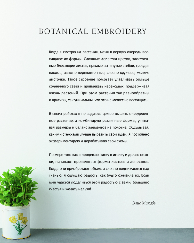 💳 Оплатить за товар можно при получении 🇰🇿 Есть бесплатная доставка по Казахстану от 1 дня 🎁 Копите бонусы с каждой покупки Серия: Шедевры мировой вышивки Элис Макабэ — знаменитая японская художница и вышивальщица, заработавшая мировую известность и признание. Ее книга «Вышивка Элис Макабэ. Сказки японского леса» стала бестселлером! Каждый день, беря в руки нитки и иголку, она стремится запечатлеть каждое мгновение, каждый особенный момент дня. Проследите за изменчивой красотой растений с помощью вышивки! В своей новой книге Элис Макабэ предлагает найти вдохновение в растениях вокруг вас: нежные лепестки, тонкие побеги, радостные соцветия и строгие иголки. Все они по-своему прекрасны, а в течение дня и в зависимости от погоды могут меняться до неузнаваемости. |