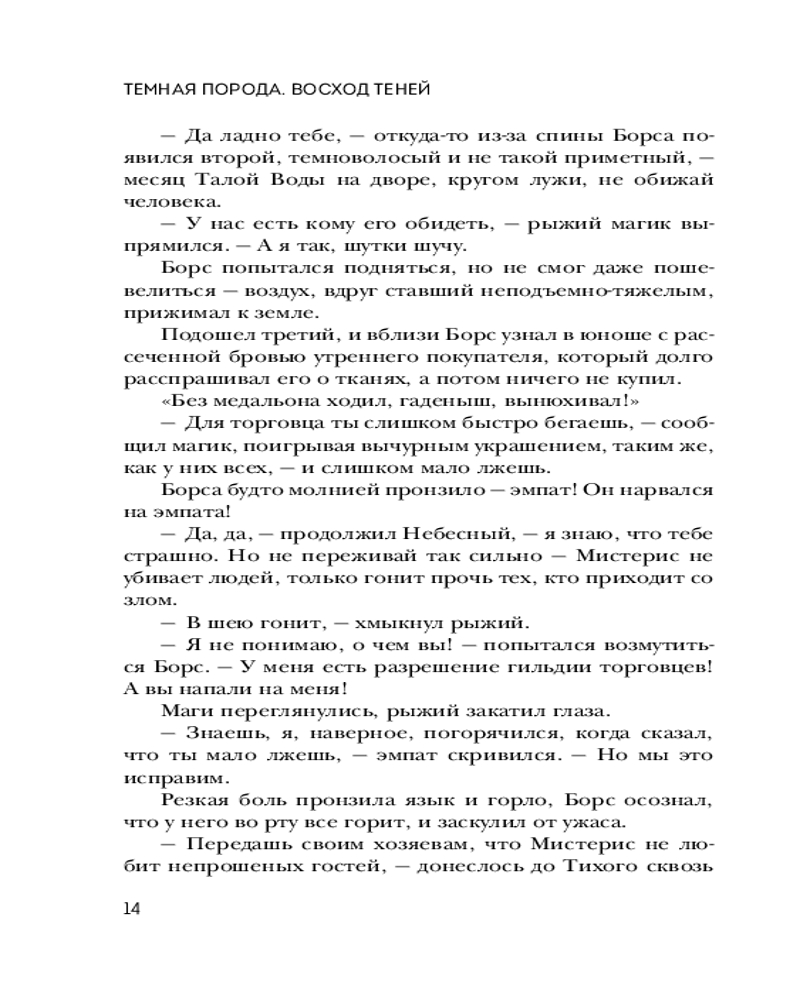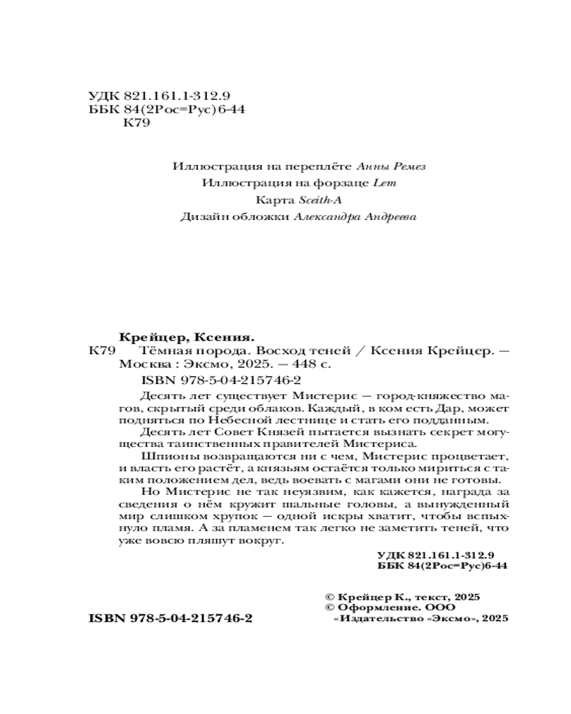 💳 Оплатить за товар можно при получении 🇰🇿 Есть бесплатная доставка по Казахстану от 1 дня 🎁 Копите бонусы с каждой покупки Серия: Young Adult. Книжный бунт. Фантастика Десять лет существует Мистерис — город-княжество магов, скрытый среди облаков. Каждый, в ком есть Дар, может подняться по Небесной лестнице и стать его подданным. Десять лет Совет Князей пытается вызнать секрет могущества таинственных правителей Мистериса. Шпионы возвращаются ни с чем, Мистерис процветает, и власть его растёт, а князьям остаётся только мириться с таким положением дел, ведь воевать с магами они не готовы. Но Мистерис не так неуязвим, как кажется, награда за сведения о нём кружит шальные головы, а вынужденный мир слишком хрупок — одной искры хватит, чтобы вспыхнуло пламя. А за пламенем так легко не заметить теней, что уже вовсю пляшут вокруг. |