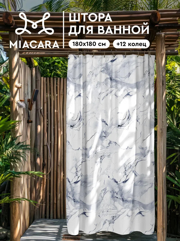 Штора для ванной не только украсит комнату, но и обеспечит вам приватность во время банных процедур. Выполненная из прочной ткани (100% п/э), шторка непроницаема для влаги и не боится въедливых загрязнений. Прочная водоотталкивающая шторка плотностью 90 г/кв. м также хорошо сохраняет цвет и рисунок, поэтому она будет долго выглядеть как новая. Тканевая штора для ванной идет в комплекте с 12 пластиковыми кольцами: крепления надежно удерживают непромокаемую шторку за нержавеющие металлические люверсы. Стильная черная занавеска размером 180×180 см красиво смотрится с золотисто-серебристым рисунком: имитацией мрамора. Она со стилем дополнит интерьер ванной и понравится ценителям эстетичных аксессуаров для дома.