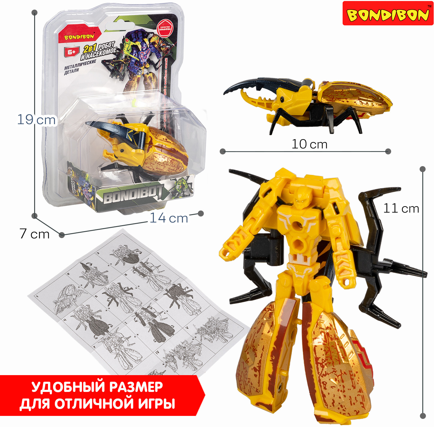 Bondibon Трансформер 2 в 1 «Жук-геркулес»В данный момент этот товар отсутствует в продаже. Возможно, у нас найдется аналогичный или похожий товар здесь. Серия: Bondibot Познакомься с сильнейшим из трансформеров — Bondibon 2в1 «Жук-геркулес» от бренда Bondibon! Мощная жёлтая фигурка с металлическими деталями воплощает выносливость и силу, объединяя образ жука-геркулеса и боевого механоида. Простая трансформация позволяет ребёнку легко превратить игрушку из насекомого в робота. Каждый поворот и щелчок — шаг в мир фантазии, битв и героизма. Трансформер 2в1. |