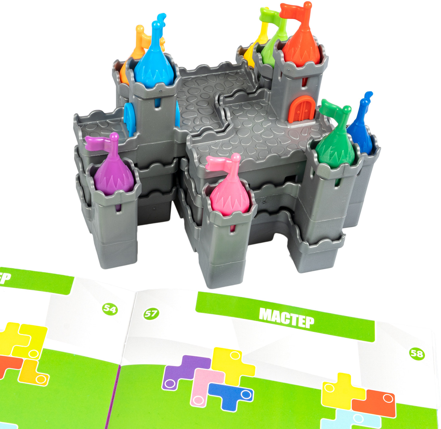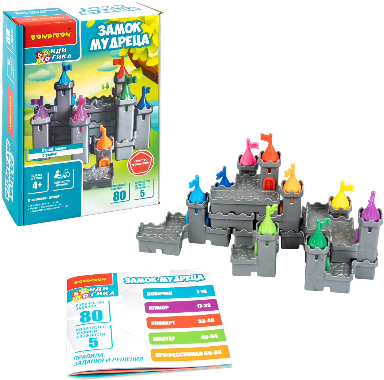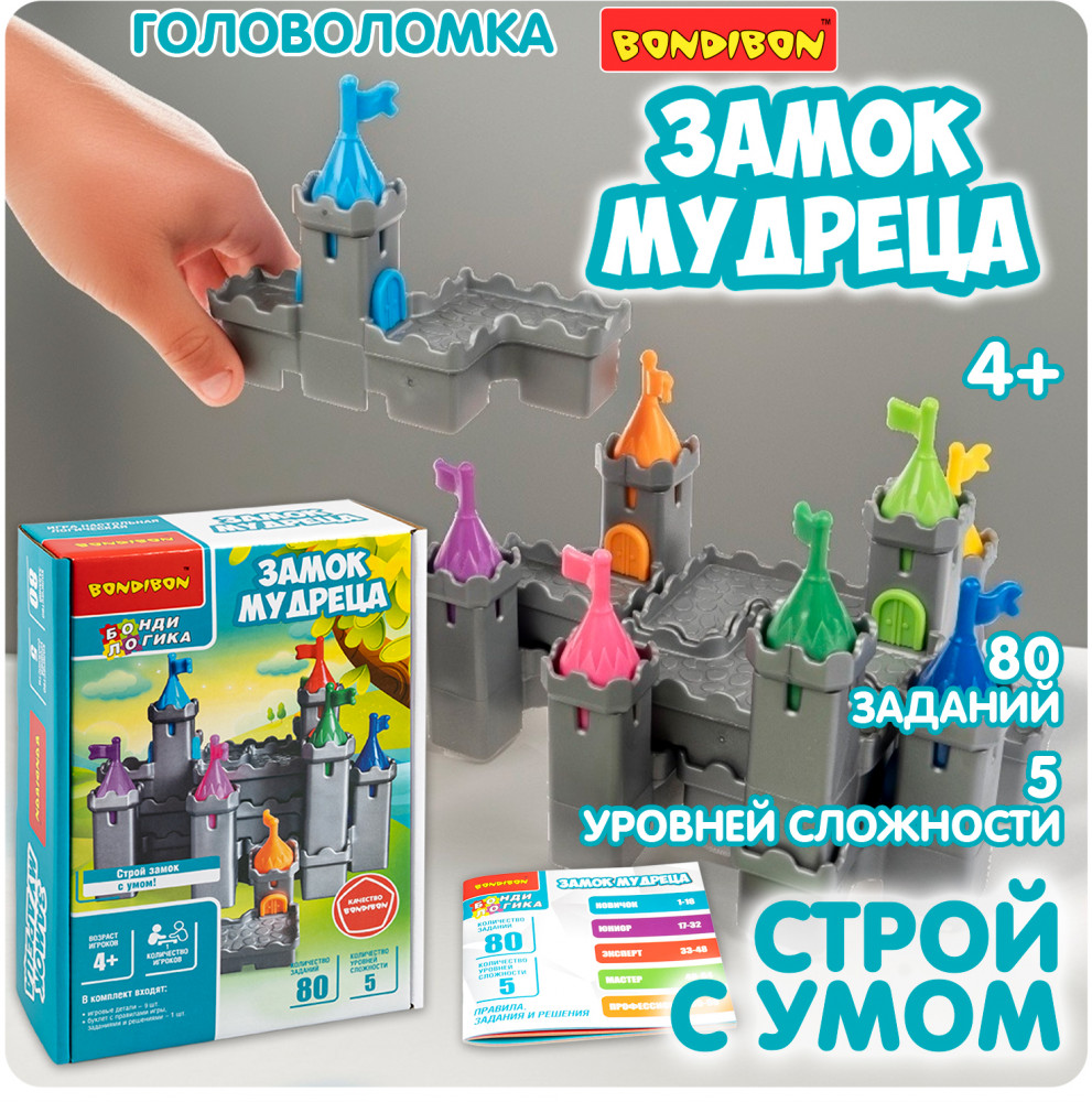 Проверь смекалку и сообразительность — попробуй построить замок, достойный мудреца! Настольная логическая игра-головоломка «Замок мудреца» из серии Бондилогика от Bondibon — это 80 заданий разного уровня сложности, красочные детали и увлекательный процесс. Игроку предстоит решать задачи, размещая фигурные элементы на башнях замка по определённым схемам. Постойте первый этаж как указано в задании, а затем, не выходя за границы замка, разместите все оставшиеся детали в виде второго этажа. Уровни варьируются от «Новичка» до «Профессионала» — игра растёт вместе с ребёнком!