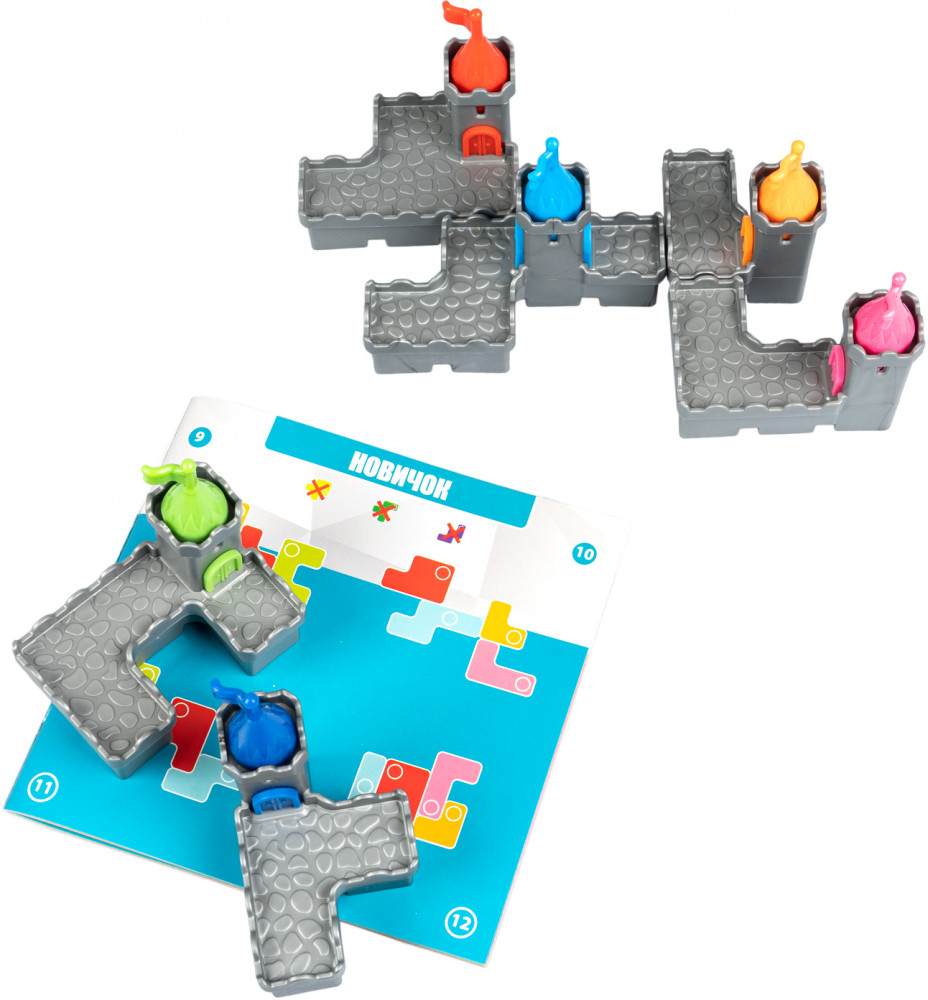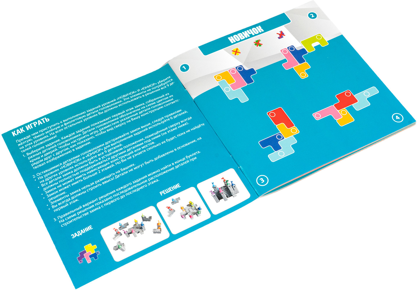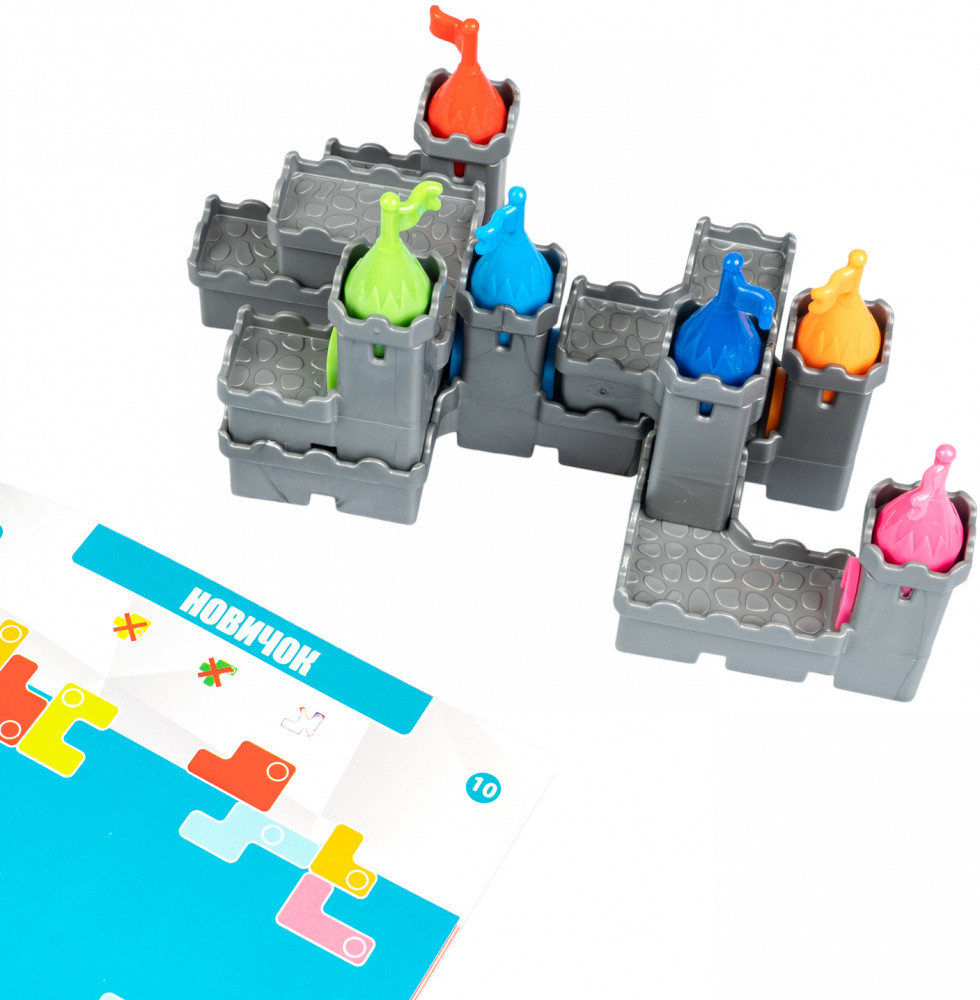 Проверь смекалку и сообразительность — попробуй построить замок, достойный мудреца! Настольная логическая игра-головоломка «Замок мудреца» из серии Бондилогика от Bondibon — это 80 заданий разного уровня сложности, красочные детали и увлекательный процесс. Игроку предстоит решать задачи, размещая фигурные элементы на башнях замка по определённым схемам. Постойте первый этаж как указано в задании, а затем, не выходя за границы замка, разместите все оставшиеся детали в виде второго этажа. Уровни варьируются от «Новичка» до «Профессионала» — игра растёт вместе с ребёнком!