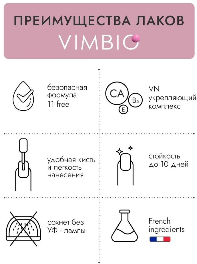 Лаки для ногтей Vimbio с безопасной формулой 11-free — это не просто уход, а настоящее восстановление для ослабленных ногтей после гель-лаков. Благодаря отсутствию 11 самых вредных компонентов, формула заботится о здоровье ваших ногтей, исключая агрессивное воздействие. В составе — лечебные экстракты растений и масел, которые питают и восстанавливают ногтевую пластину. Экстракты водорослей уменьшают ломкость и способствуют росту крепких ногтей, натуральные масла арганы и оливы глубоко увлажняют и придают блеск, а витамины E и A возвращают ногтям жизненную силу. Дополнительно кальций, гексаналь, пантотеновая кислота и витамин B5 укрепляют структуру ногтя, предотвращая его расслаивание и ломкость. Линия лаков Vimbio — это ваш путь к здоровым, сильным и красивым ногтям без компромиссов.