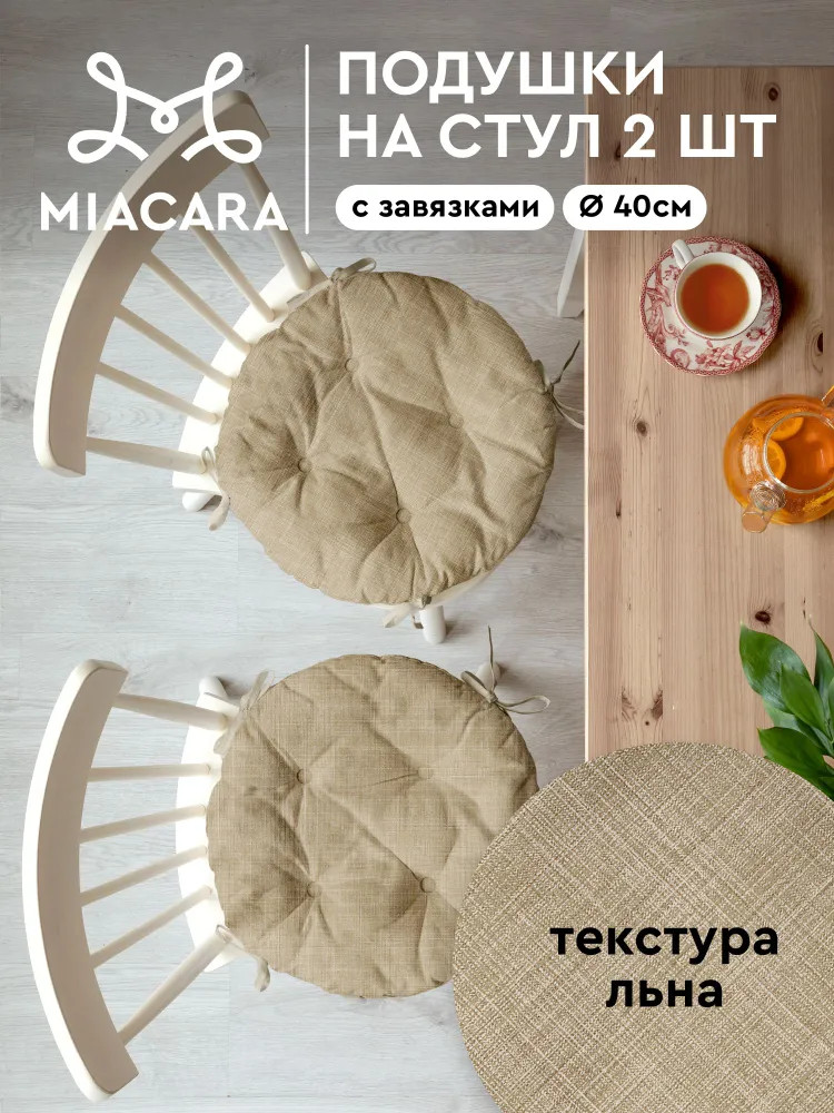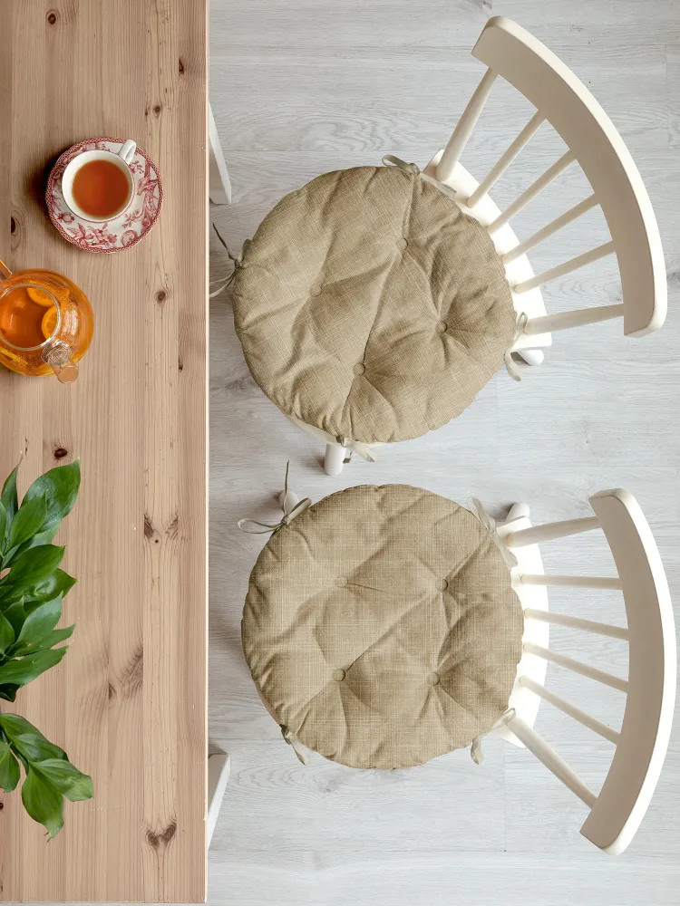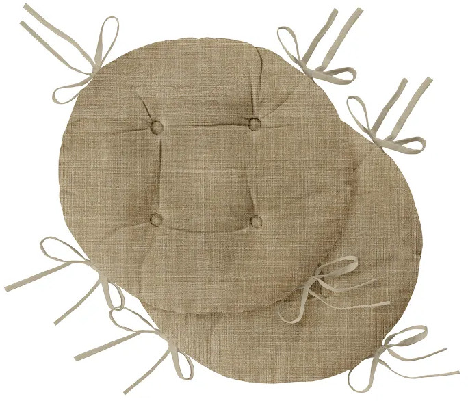 Набор круглых подушек на стулья (радиус 40 см, 2 шт) идеально дополнит интерьер кухни или гостиной. Завязки по углам будут прочно фиксировать подушки на стульях, обеспечивая вам максимальный комфорт при посадке. Чехол из рогожки (100% хлопок) имитирует лен и отличается стойкостью к износу, а мягкий и упругий наполнитель подушечек хорошо сохраняет форму. Подушки плотностью 165 г/м2 — настоящая находка для обладателей стульев с твердым сидением. Они позволят сделать ваш отдых гораздо комфортнее.