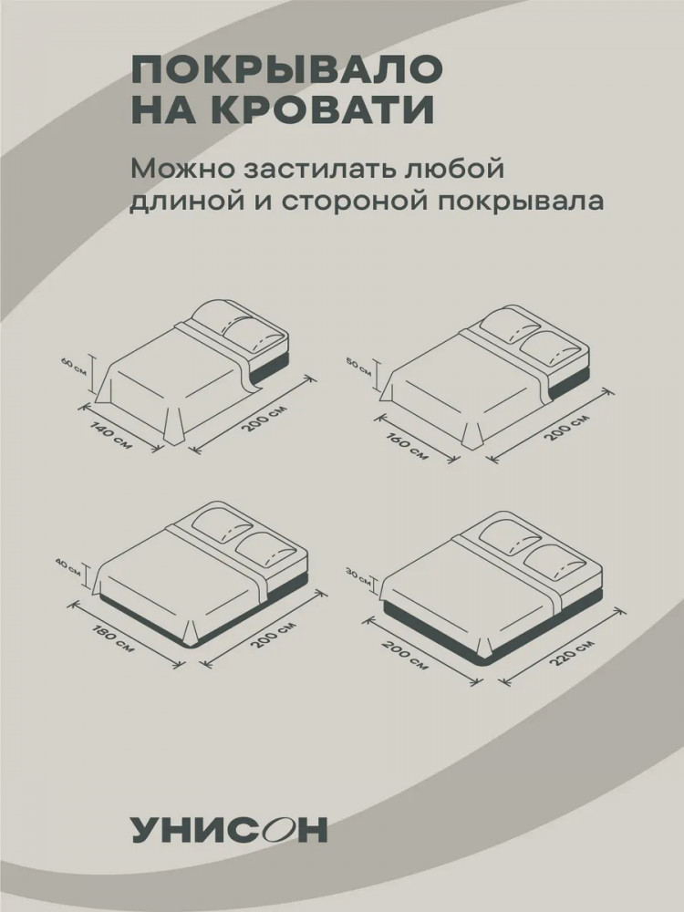 Покрывало от Унисон также может стать отличным подарком. Стильный и практичный аксессуар — идеальный выбор для близких людей, которые оценят его оригинальность и качество. Подарите близким уют и тепло, выбрав этот шикарный предмет текстиля. Кроме того, оно может использоваться как чехол на диван или накидка на кресло, добавляя элегантности вашему дому. Заходите в мир стиля и комфорта с покрывалом на кровать от «Унисон». Применяйте его не только в интерьере, но и на свежем воздухе, используя как пляжное покрывало. Так же большое покрывало можно использовать как легкое одеяло — универсальность в вашем распоряжении. Легкость, практичность и стиль — все это вы найдете в покрывале «Унисон». Позвольте вашему дому выглядеть еще красивее и более уютно с помощью этого великолепного изделия.