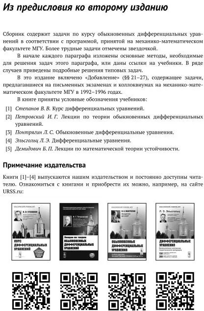 Сборник задач по дифференциальным уравнениямВ данный момент этот товар отсутствует в продаже. Возможно, у нас найдется аналогичный или похожий товар здесь. Серия: Классический учебник МГУ Предлагаемая читателю книга содержит материалы для упражнений по курсу дифференциальных уравнений для университетов и технических вузов с усложненной математической программой. Помимо задач, составленных автором или взятых из известных задачников, и методов их решения, в книгу включены задачи, предлагавшиеся на письменных экзаменах на механико-математическом факультете МГУ имени М.В.Ломоносова. Настоящее издание является хорошим дополнением к известному учебнику А.Ф.Филиппова «Введение в теорию дифференциальных уравнений» (М., URSS), но может быть использовано в качестве самостоятельного учебного пособия как студентами-математиками, так и специалистами в разных областях естественных наук, применяющими математику в своей работе. |