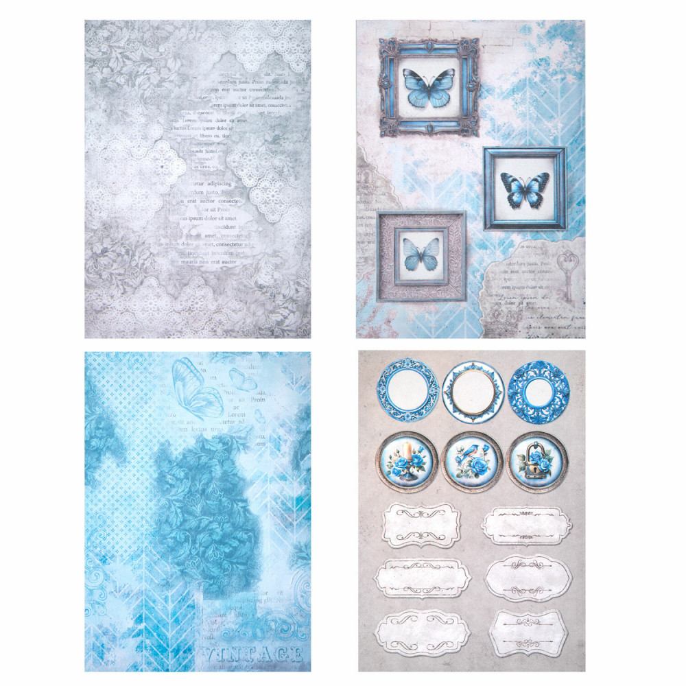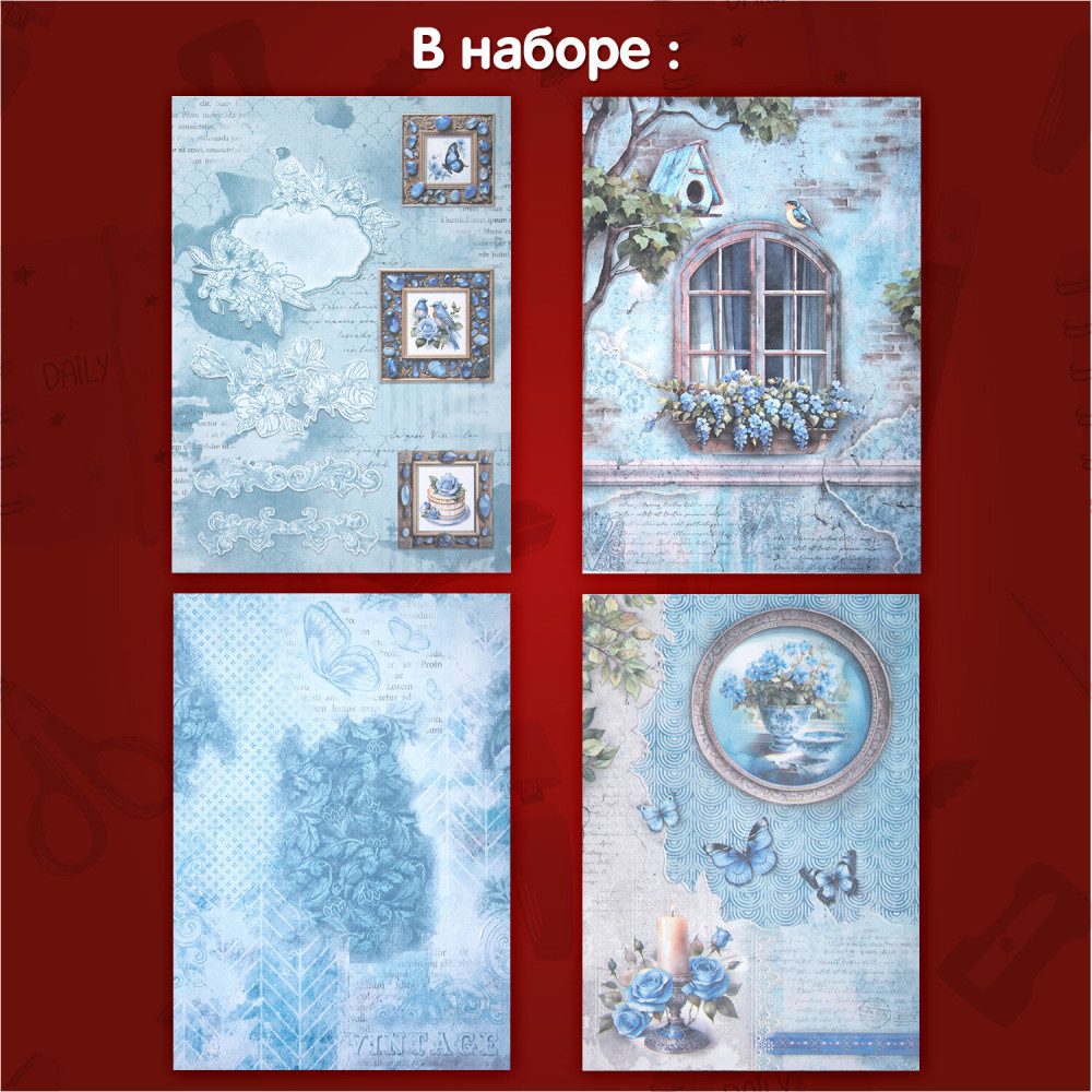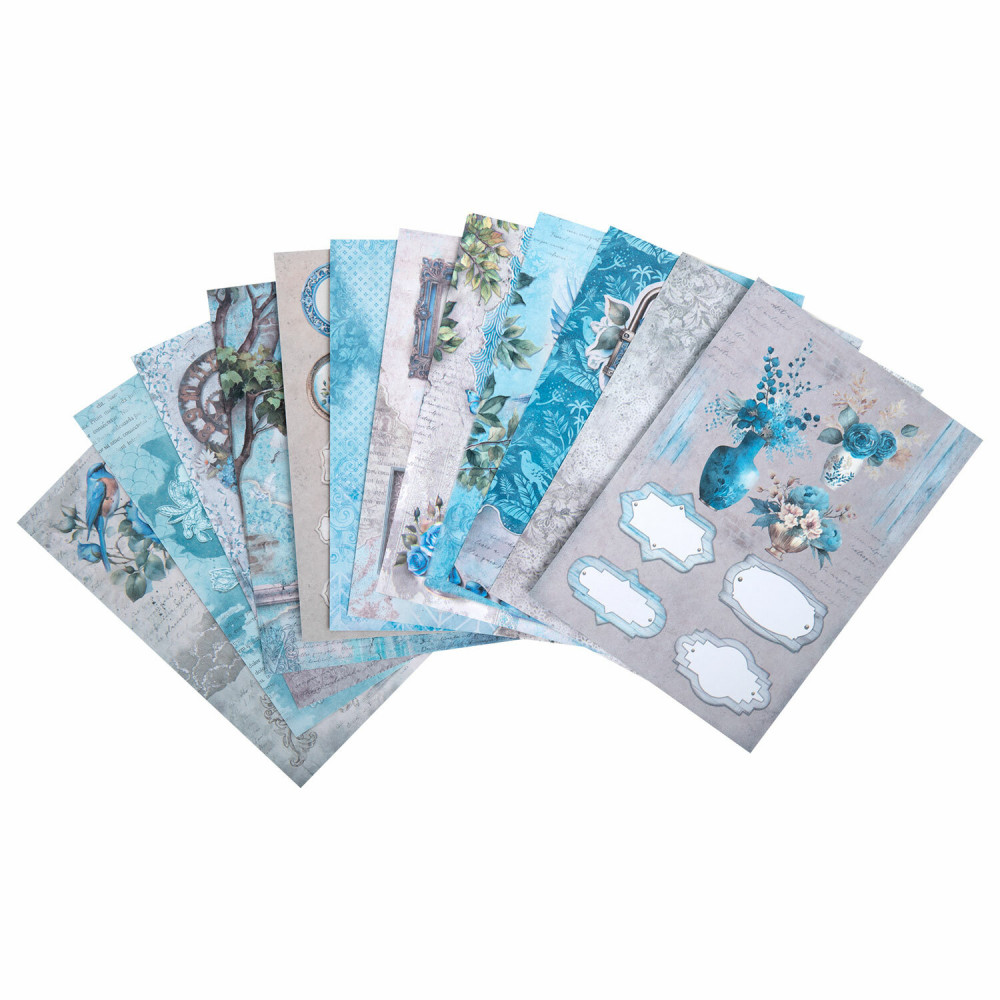Стиль «В лазурных тонах» содержит спокойные дизайны в бежево-голубых тонах и прекрасно подойдёт для создания фотоальбомов, блокнотов для записей и других изделий. В набор входят 12 листов двусторонней бумаги плотностью 240 г/м2, содержащих 12 вариантов дизайна: 10 фоновых дизайнов и 2 набора с фигурными вырубками для вырезания. Стандартный размер бумаги (15×21 см) делает её удобной для использования в создании скрап-альбомов. Матовая бумага отличается высоким качеством печати.