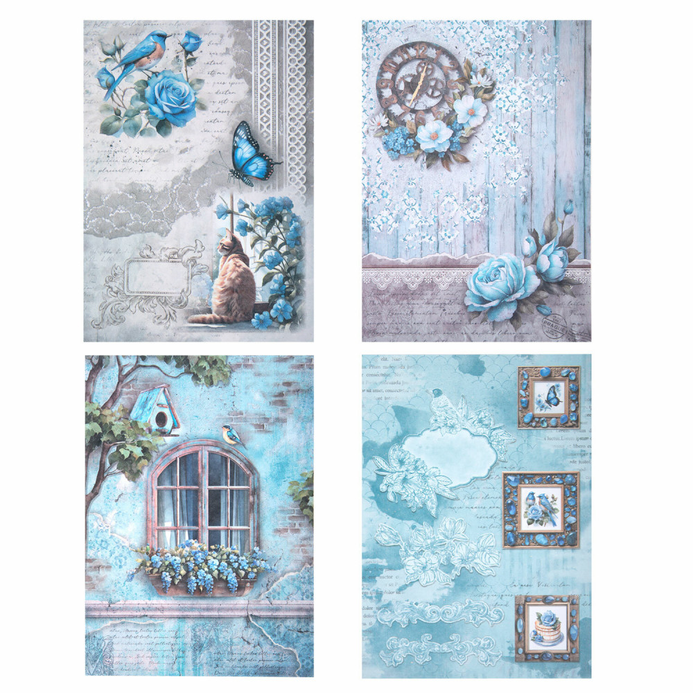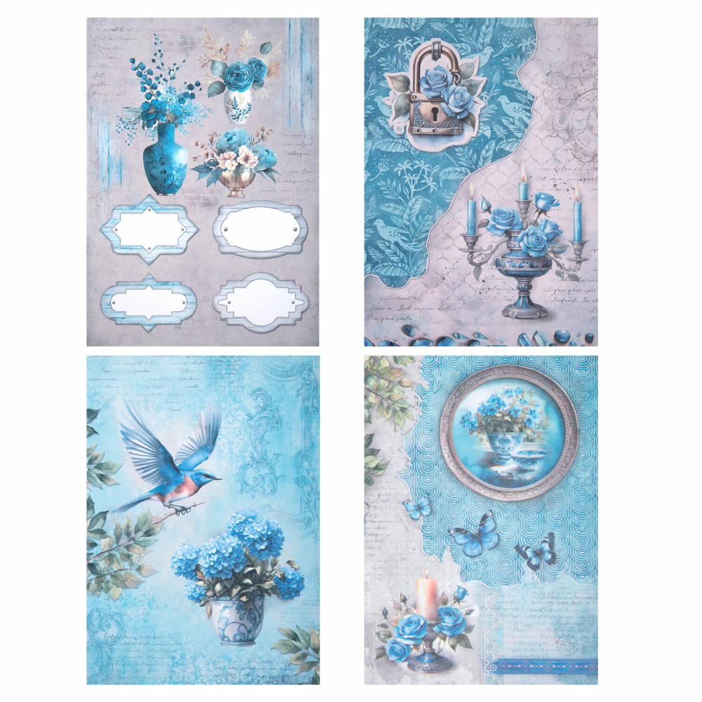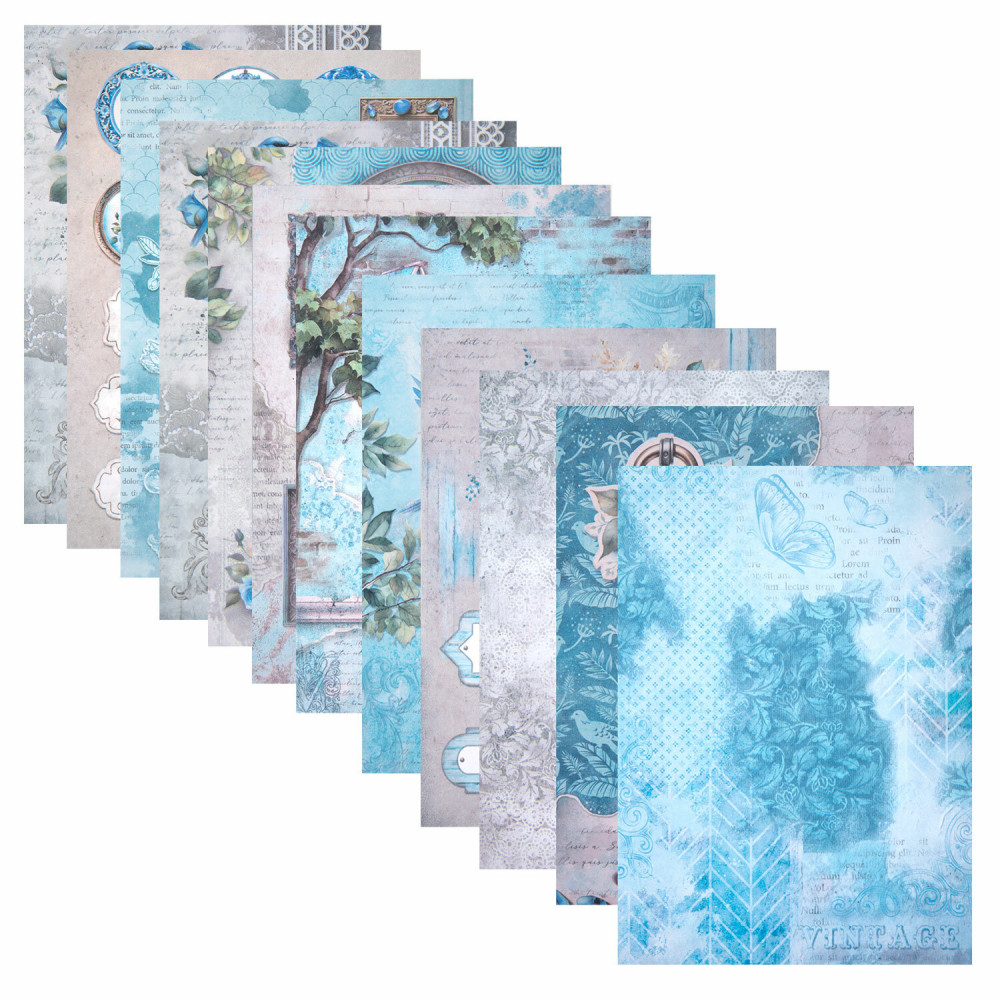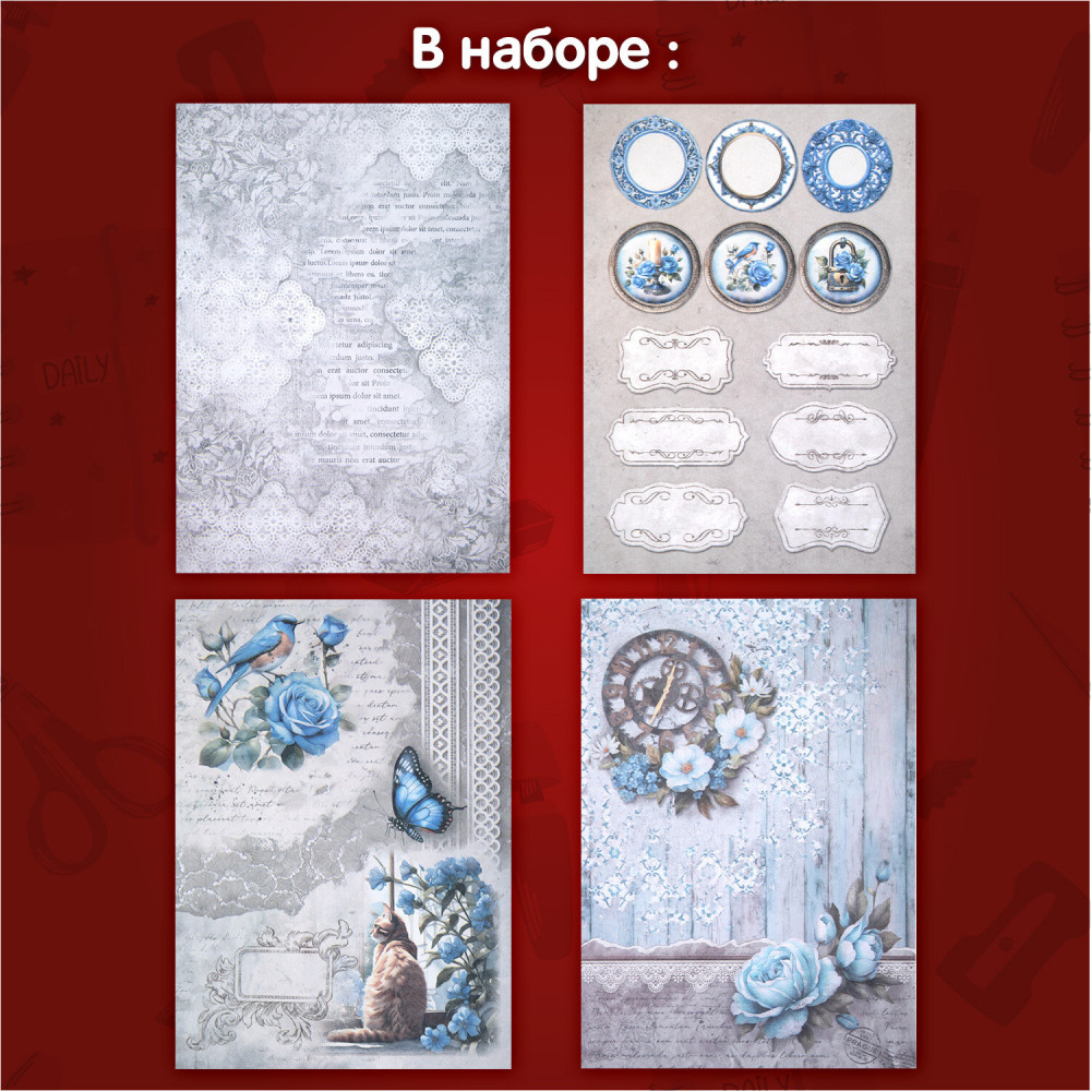 Стиль «В лазурных тонах» содержит спокойные дизайны в бежево-голубых тонах и прекрасно подойдёт для создания фотоальбомов, блокнотов для записей и других изделий. В набор входят 12 листов двусторонней бумаги плотностью 240 г/м2, содержащих 12 вариантов дизайна: 10 фоновых дизайнов и 2 набора с фигурными вырубками для вырезания. Стандартный размер бумаги (15×21 см) делает её удобной для использования в создании скрап-альбомов. Матовая бумага отличается высоким качеством печати.