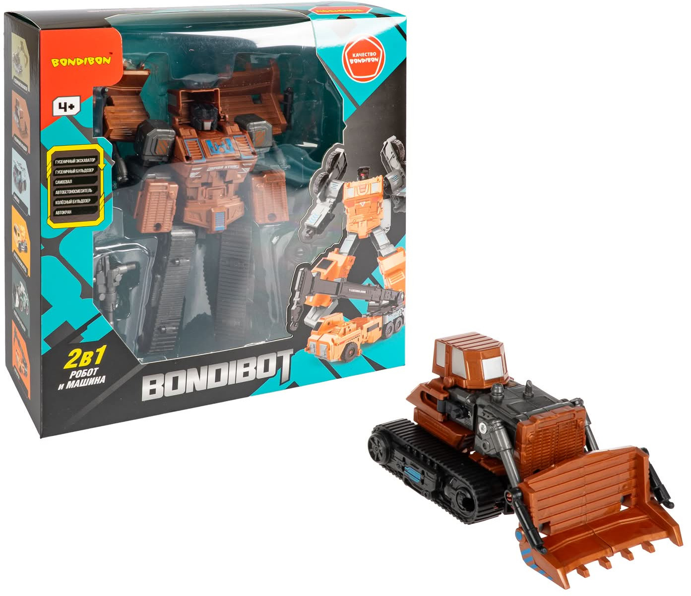 Игрушка выполнена в насыщенных оттенках, устойчива и безопасна для детской игры. Трансформер 2в1 «Робот-гусеничный бульдозер» развивает пространственное мышление, мелкую моторику, внимательность и воображение. Рекомендовано детям от 4 лет. Игрушка выполнена из прочных и безопасных материалов и соответствует высоким стандартам качества бренда Бондибон. Собери всю строительную серию из 6 машин и объедини их в одного большого Bondibot — суперробота!