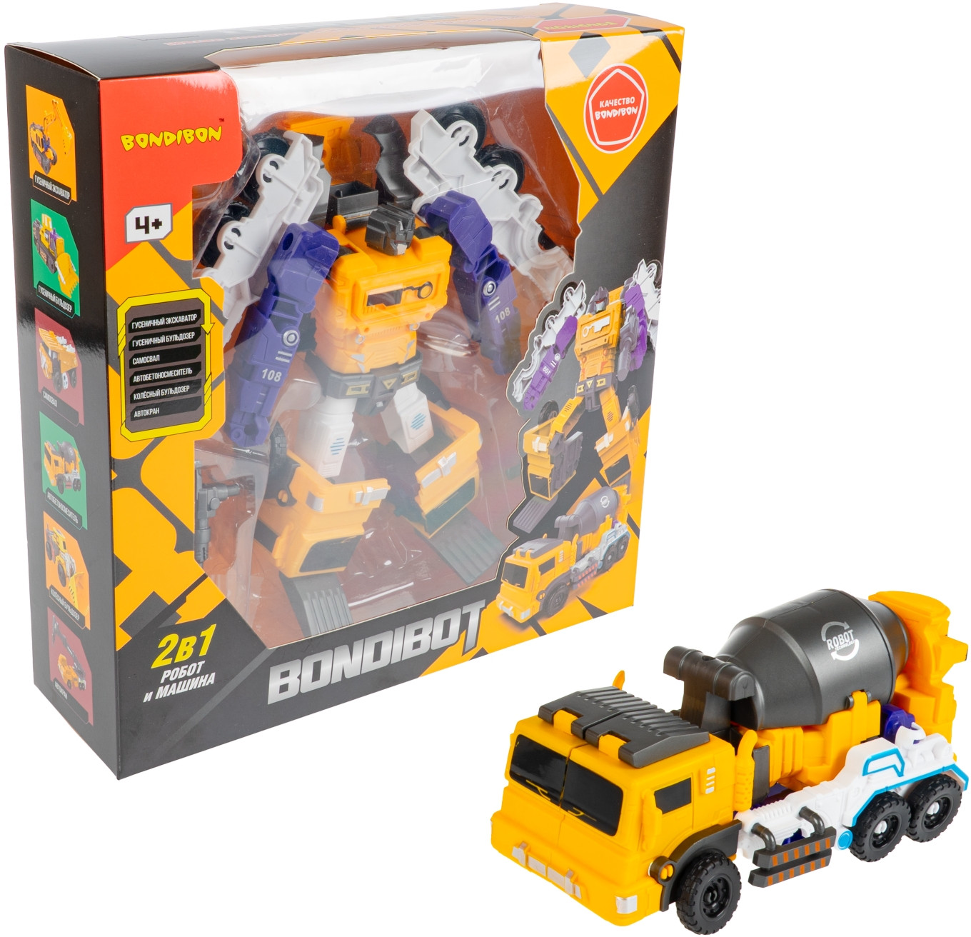 Погрузись в мир стройки и приключений вместе с роботом-автобетоносмесителем! Трансформер жёлтого цвета от бренда Bondibon объединяет тяжёлую строительную машину и динамичного трансформера, вдохновляя ребёнка на создание собственных историй. Игрушка легко трансформируется: в процессе игры ребёнок вращает барабан, двигает части кузова и создаёт нового персонажа. Такая трансформация отлично развивает мышление, пространственное восприятие и сюжетное воображение.