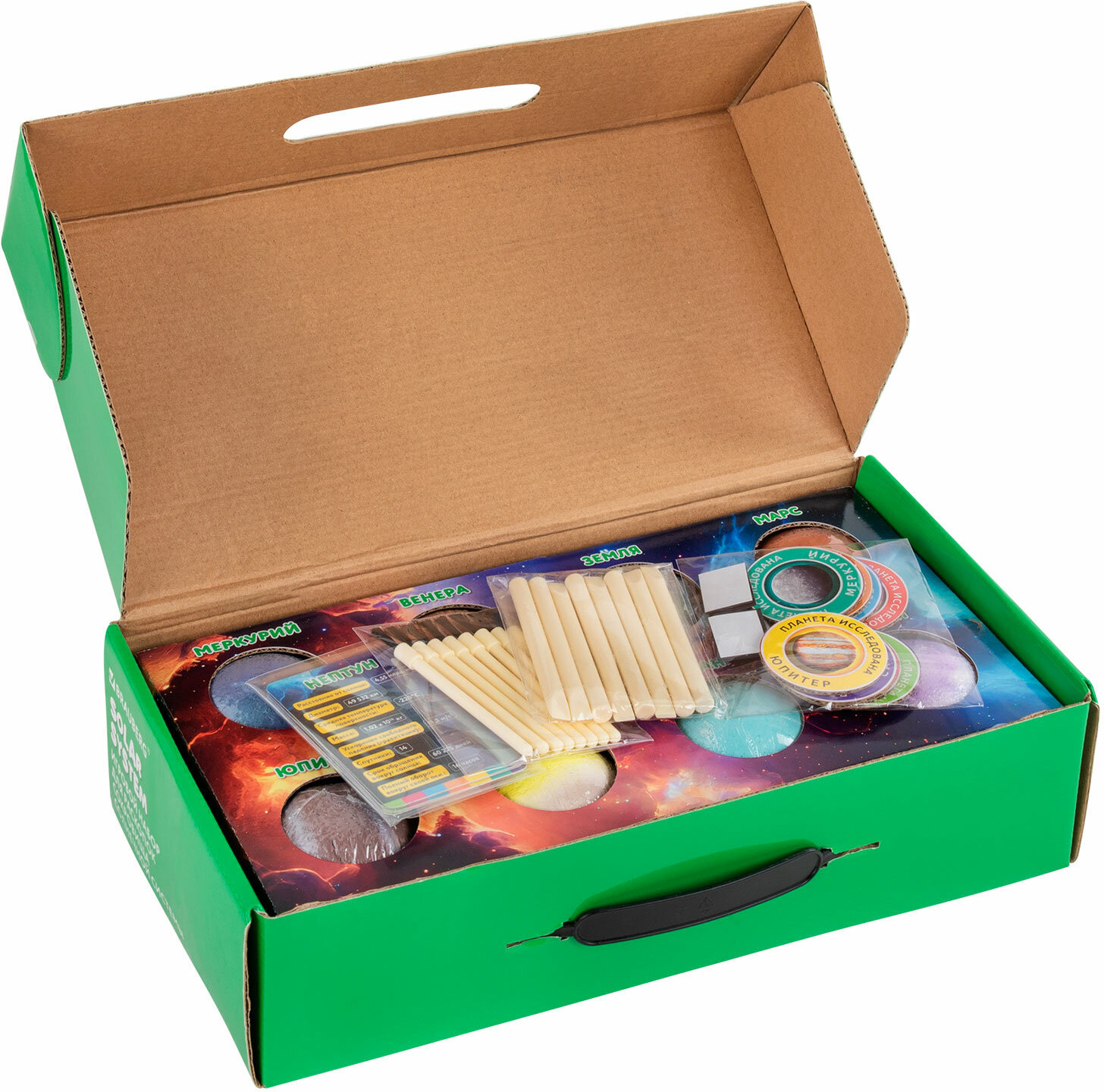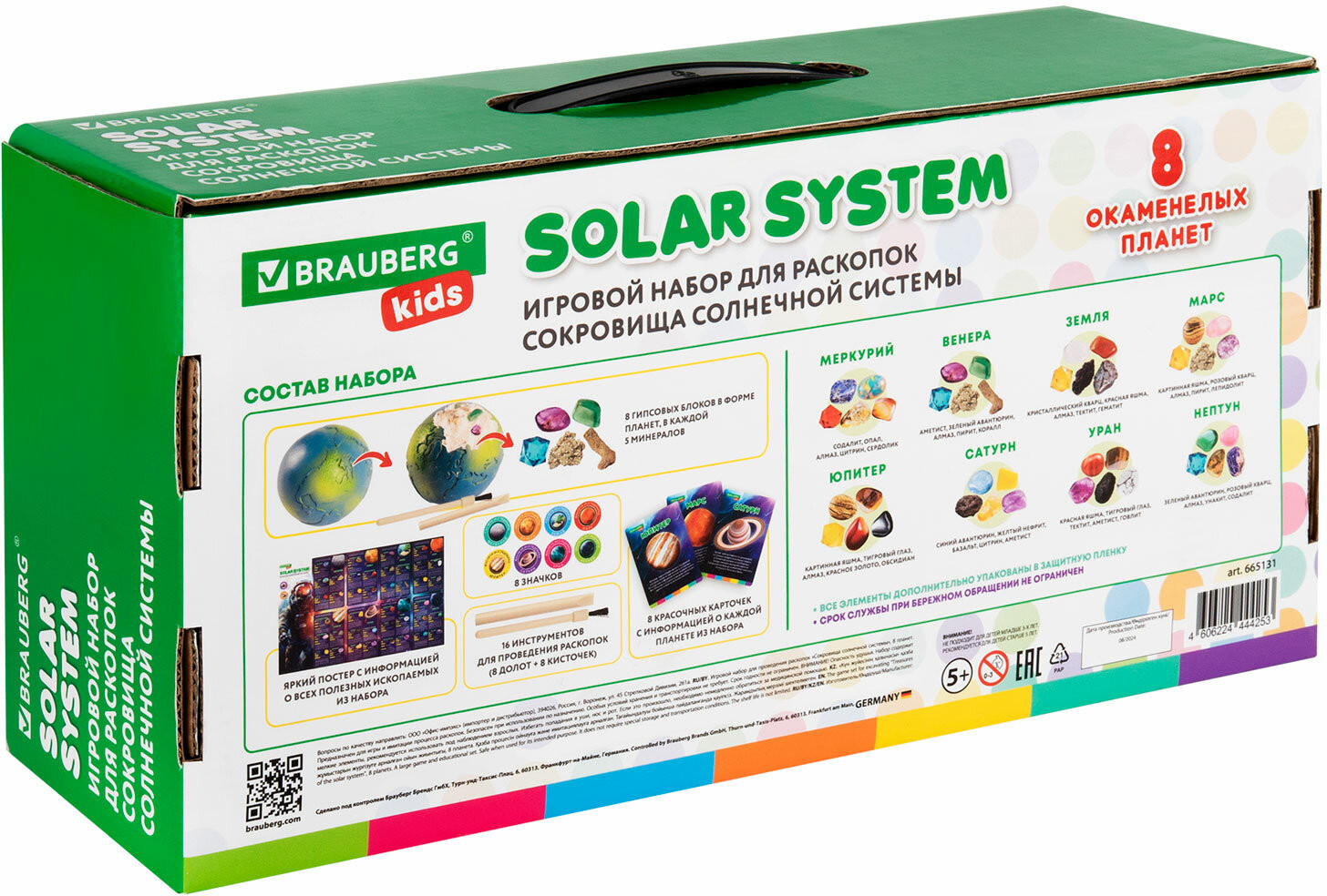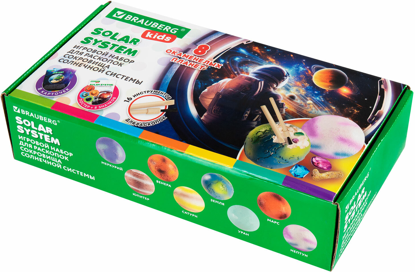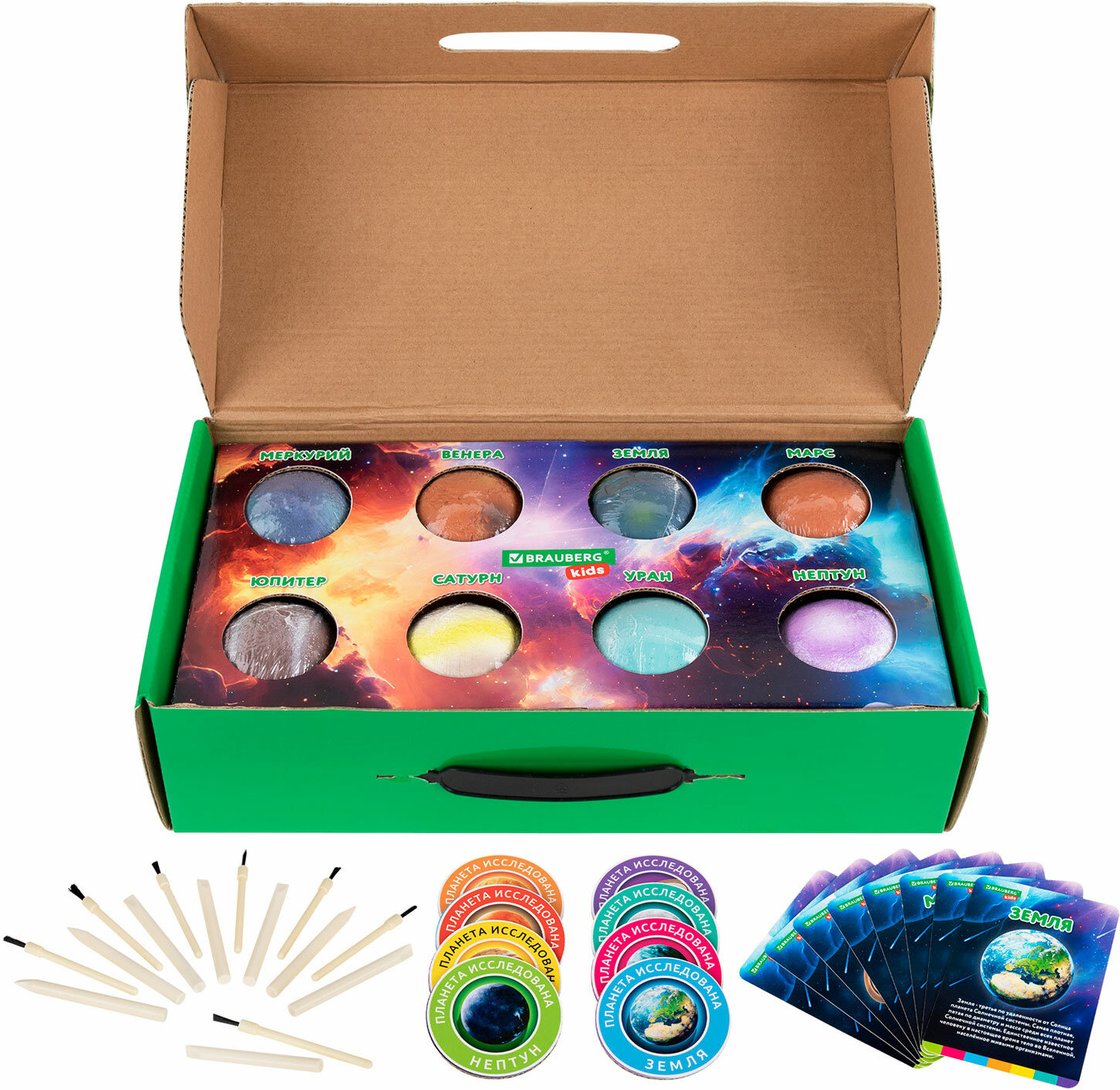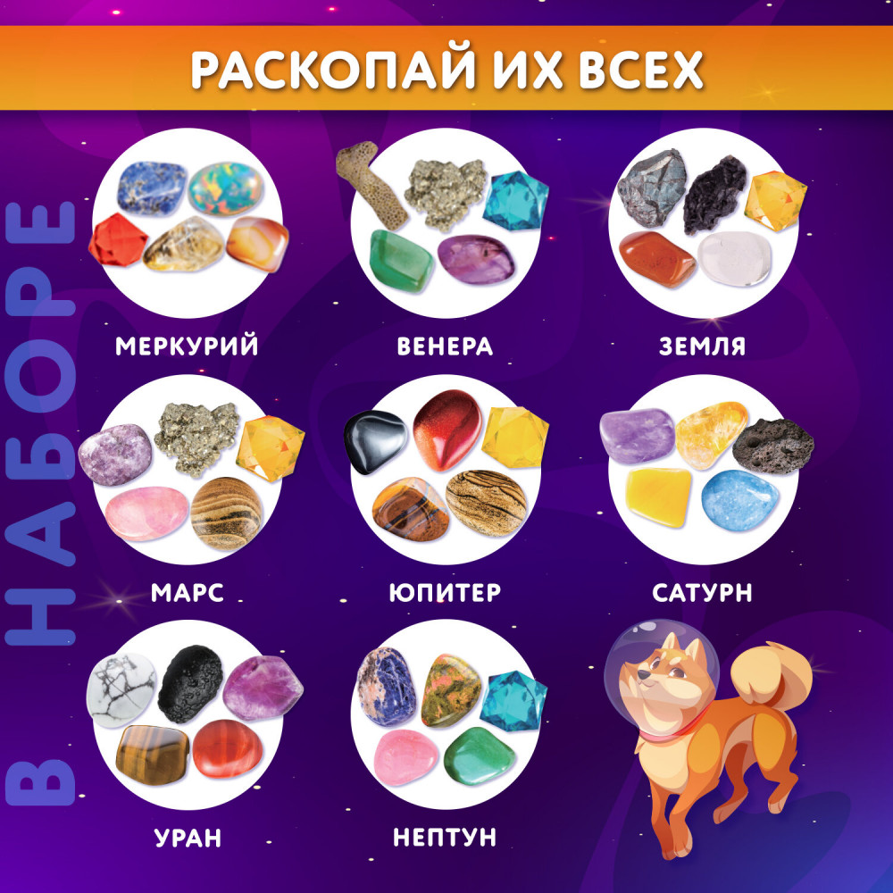 В набор входят: 8 гипсовых блоков в форме шара с минералами внутри, 16 инструментов для проведения раскопок (8 долот, 8 кисточек), 8 красочных двусторонних карточек с информацией о каждой планете, красочный постер, 8 картонных значков, 8 виниловых магнитов с клеевым слоем (для создания магнитов из картонных значков), красочный постер с информацией о каждом минерале.