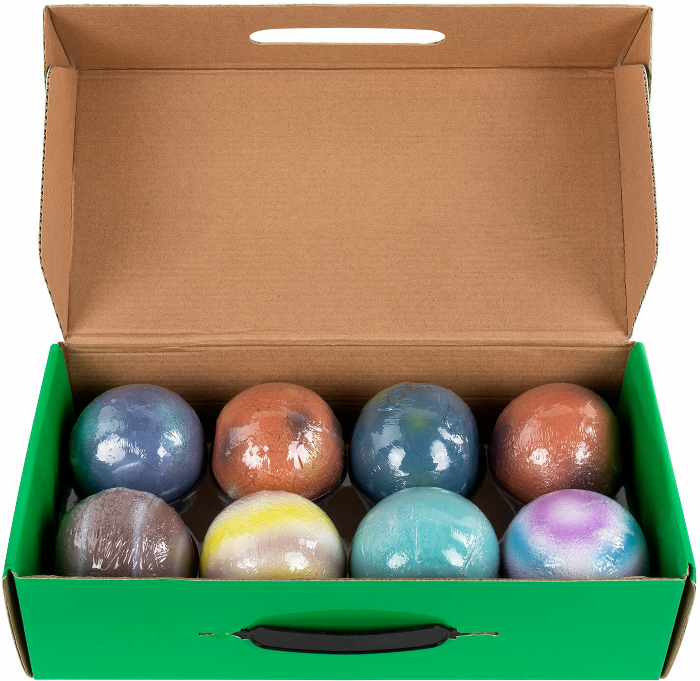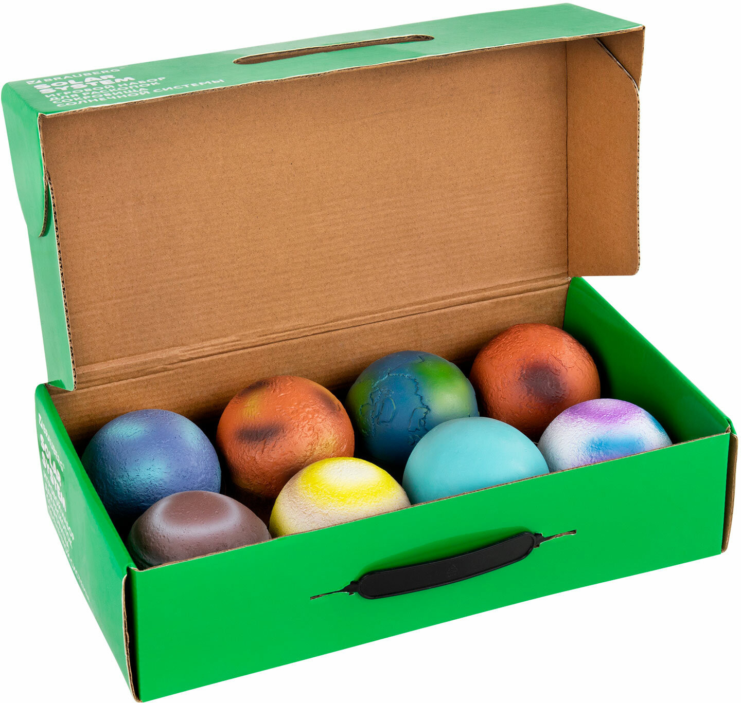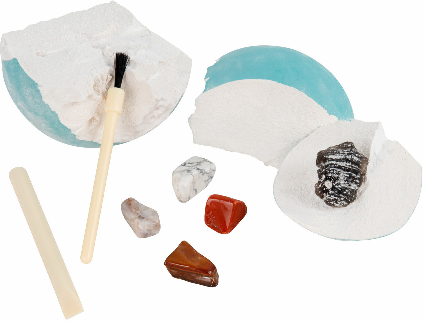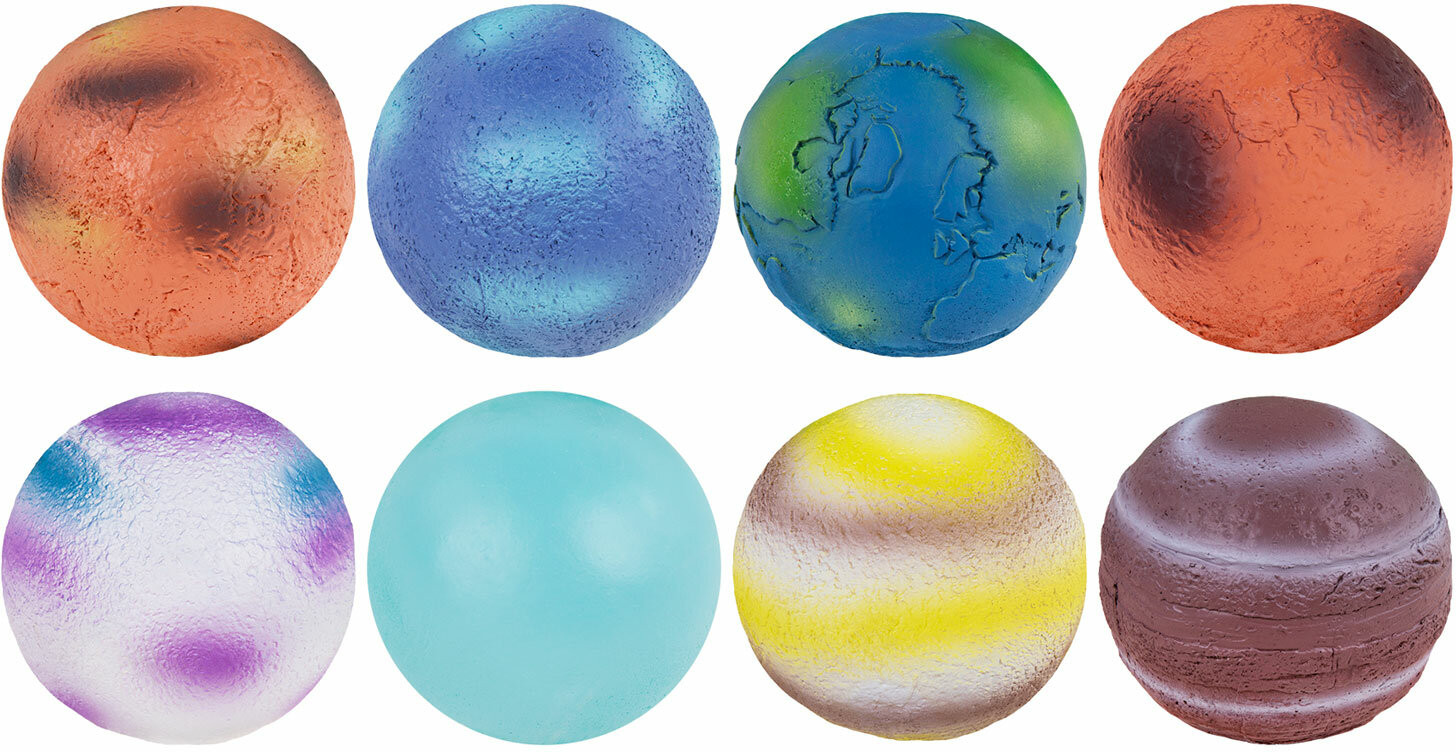 В набор входят: 8 гипсовых блоков в форме шара с минералами внутри, 16 инструментов для проведения раскопок (8 долот, 8 кисточек), 8 красочных двусторонних карточек с информацией о каждой планете, красочный постер, 8 картонных значков, 8 виниловых магнитов с клеевым слоем (для создания магнитов из картонных значков), красочный постер с информацией о каждом минерале.