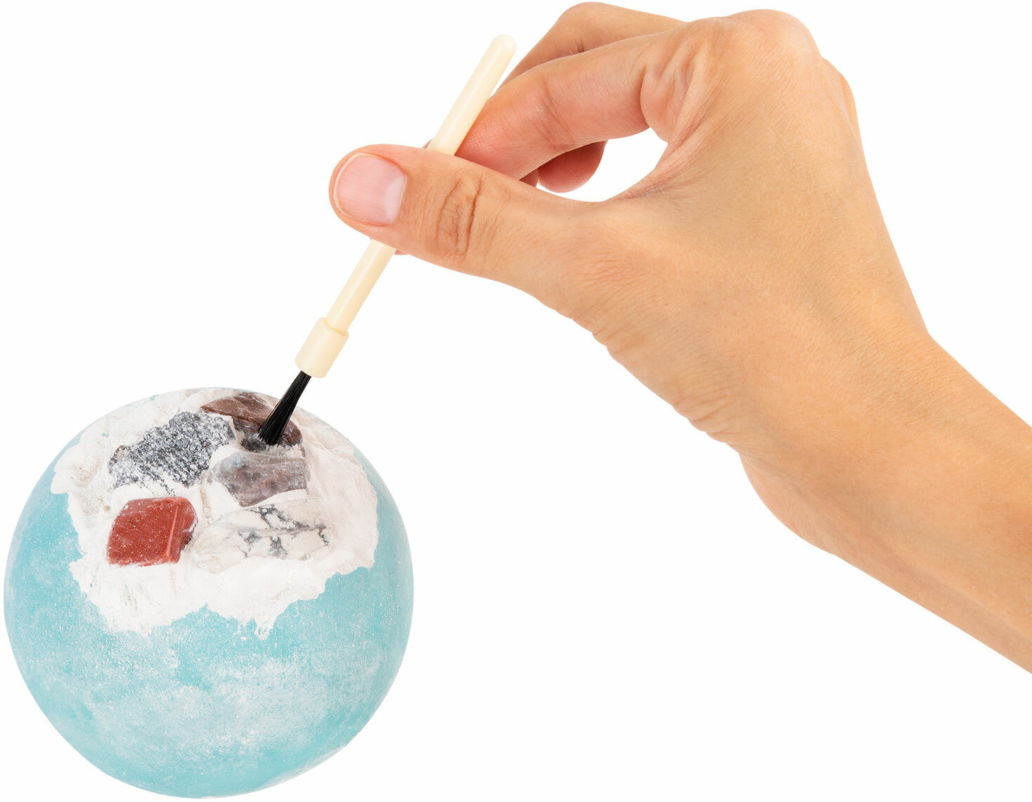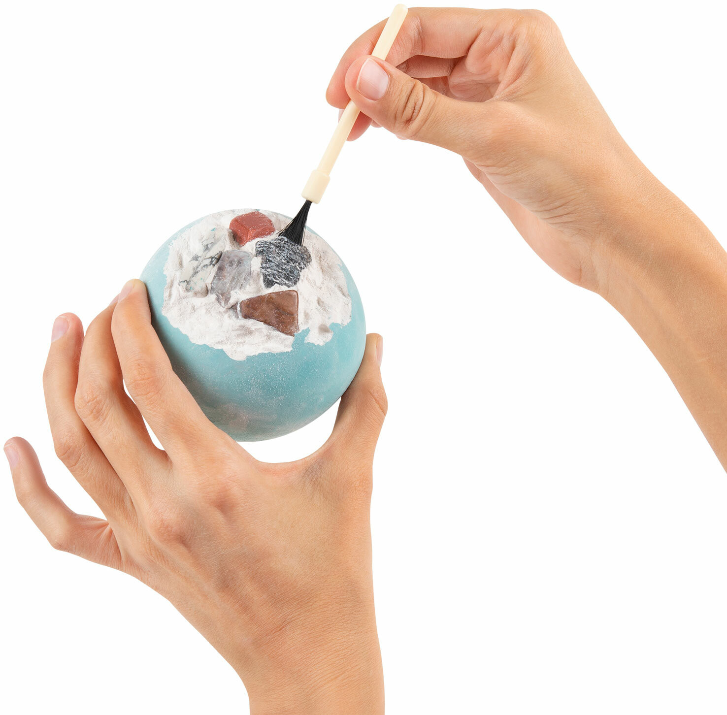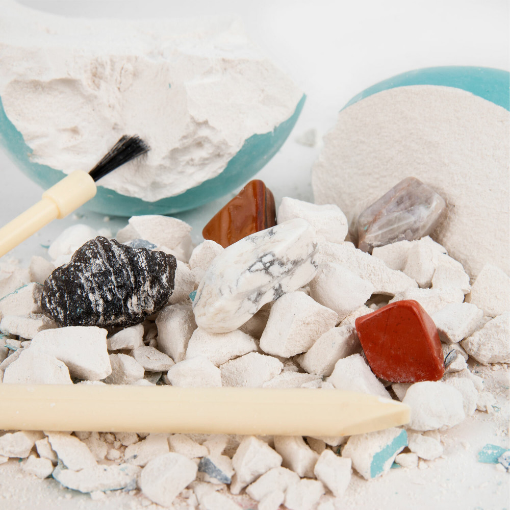 Как играть: возьмите гипсовый блок и удобно расположите для работы на поверхности. Сопоставьте его с карточкой и узнайте больше о планете, которую будете раскапывать. Возьмите долото и начинайте процесс раскопок. Когда появится какая-то часть минерала, лишний гипс можно смахнуть кисточкой. После полного освобождения камней нужно по картинке опознать минерал и прочитать информацию о нем. Таким образом, ваш ребенок будет не только увлечен процессом раскопок, но и получит ценную информацию о каждой планете и минерале из набора. Чтобы легче извлечь камень из гипсового блока, его можно поместить в воду на 15-20 минут для размягчения гипса.