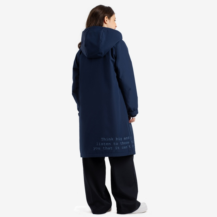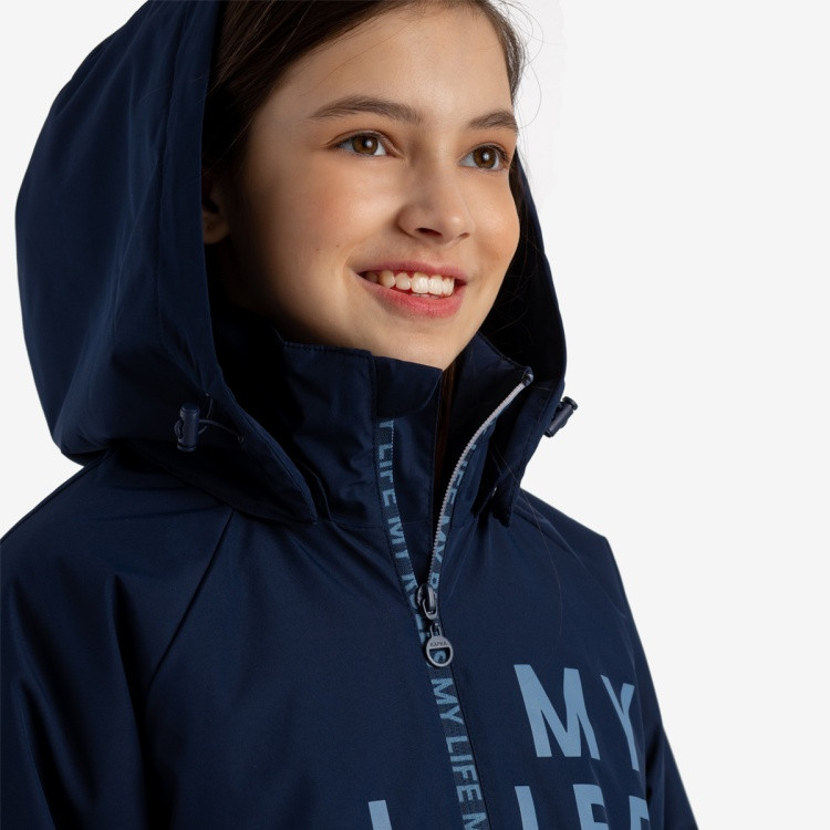 Универсальный утепленный плащ в темно синем цвете из ламинированной ткани отталкивающей влагу имеет съемный капюшон и функциональные карманы. Демисезонный плащ для школы декорирован принтами по молнии полочке и низу изделия. Утепленный плащ классического кроя идеально дополнит образ в школу.