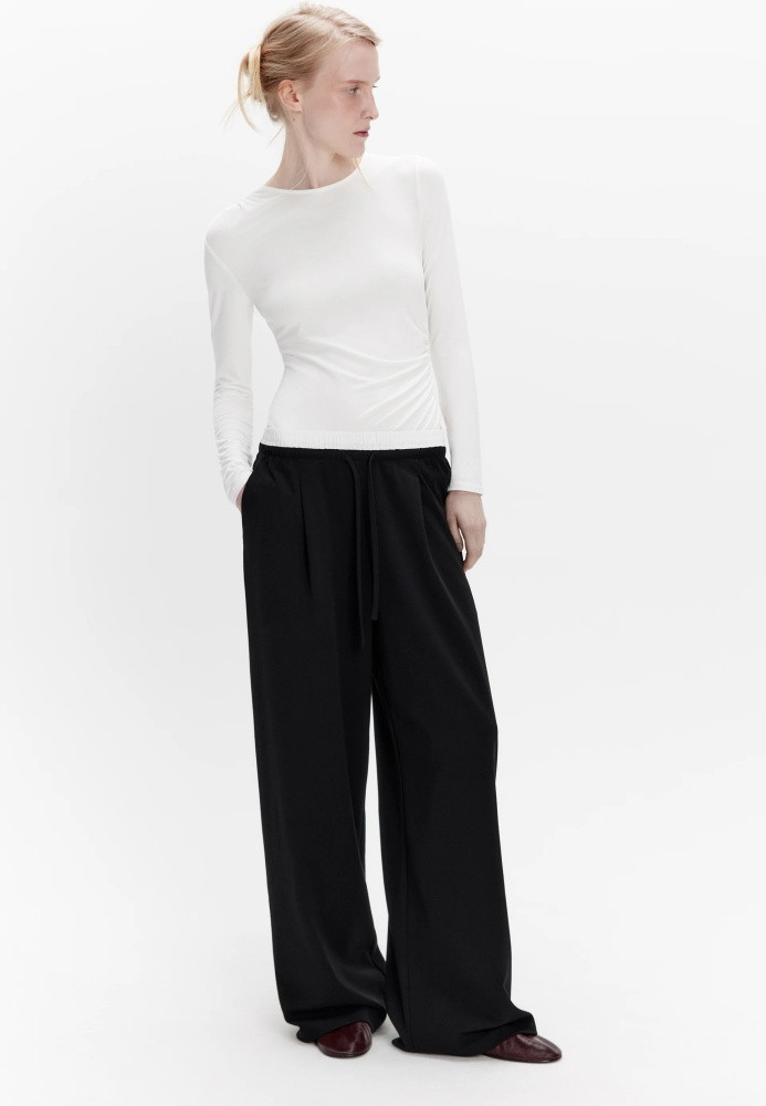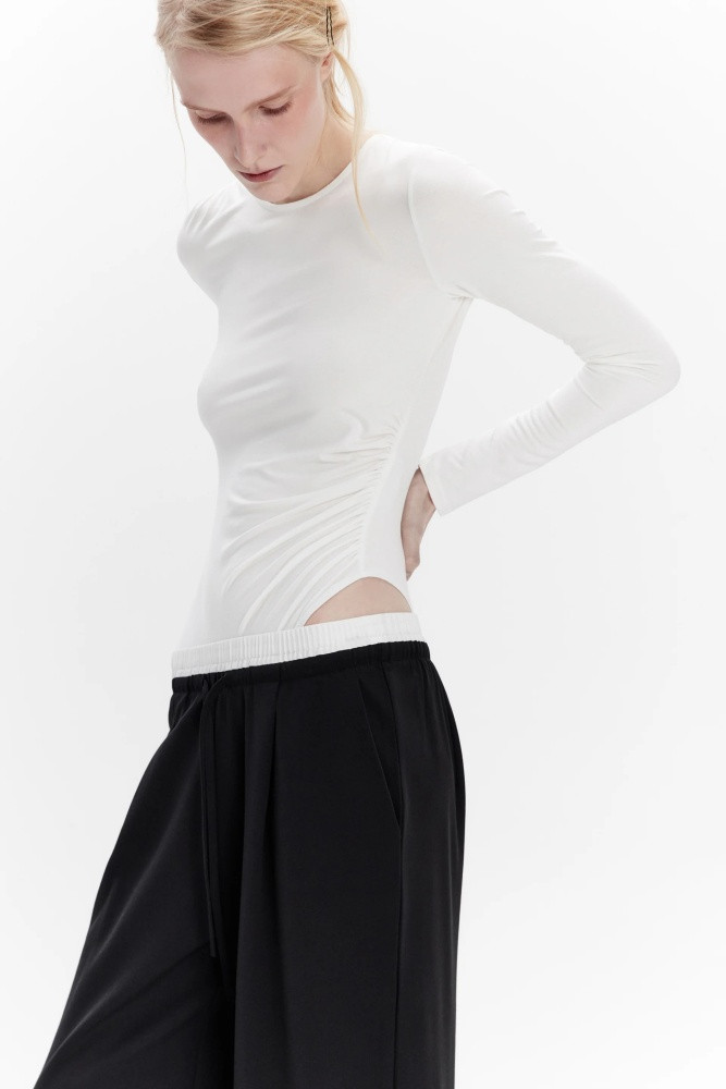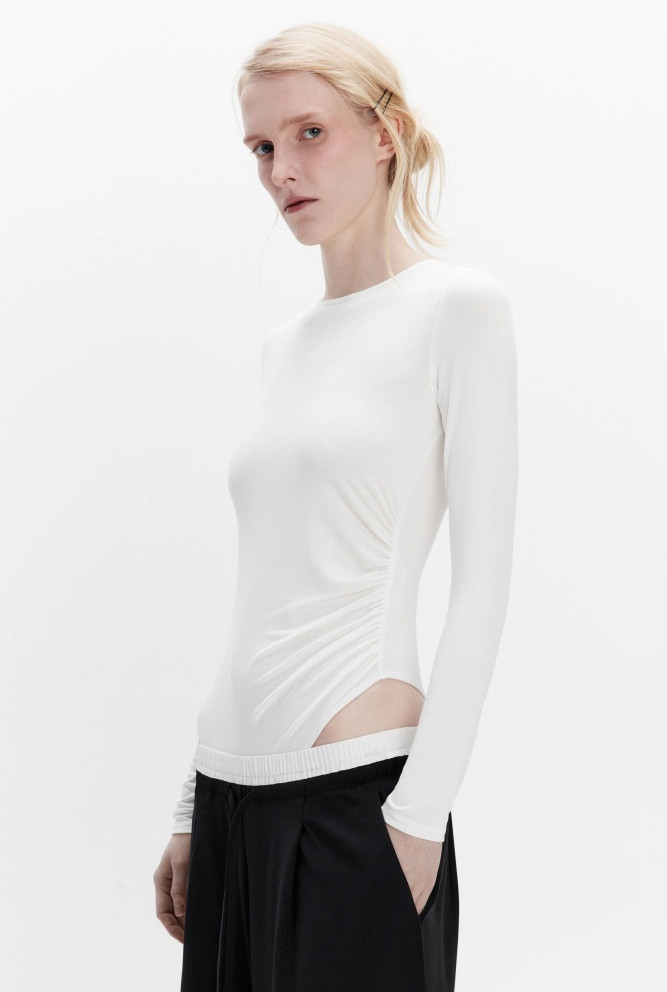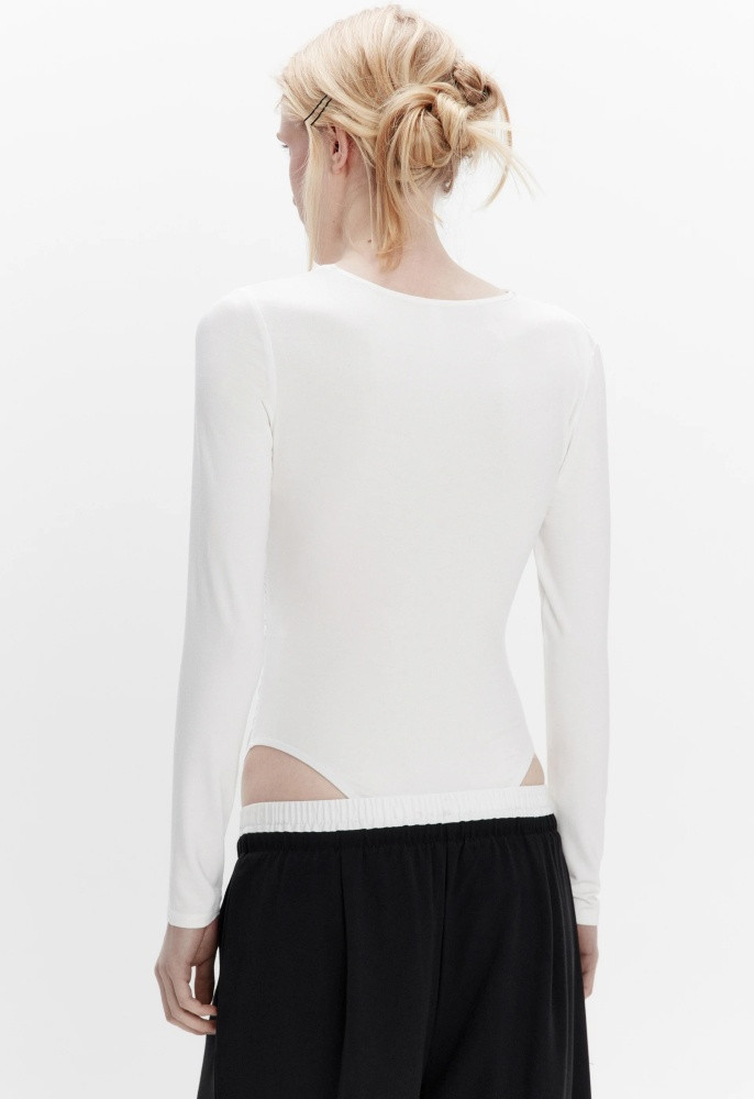 Базовое женское боди-лонгслив облегающего кроя из мягкой, эластичной вискозной ткани с гладкой трикотажной фактурой. Широкий круглый вырез горловины. Длинные облегающие рукава с прямыми манжетами и прямой линией плеча. Удобные широкие трусики-слипы с застежкой на кнопки снизу. Декоративная драпировка по бокам. Базовый облегающий лонгслив-боди с длинными рукавами для самых удобных, стильных и привлекательных аутфитов на учебу, в офис или просто на каждый день. Носи боди с юбками-годе для создания соблазнительных и женственных образов. Боди можно носить отдельно, а можно и в качестве базы для многослойных образов.