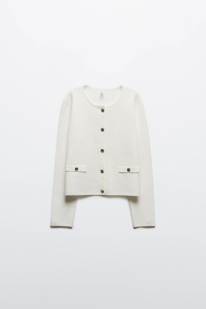Короткий женский вязаный кардиган свободного кроя из мягкой ткани толстой вязки с жаккардовой фактурой. Круглый вырез горловины без воротника. Длинные свободные рукава с прямыми манжетам и спущенной линией плеча. Застежка на крупные золотистые пуговицы спереди. Имитация карманов с застежкой на пуговицы по бокам. Женственность никогда не покинет тренды, и вещи в стиле французской богемы точно не оставят тебя без внимания. Укороченный вязаный жакет на пуговицах окутает тебя флером Chanel. Носи его отдельно или сочетай с любыми топами или блузками и создавай расслабленные повседневные, школьные, университетские и офисные луки, в которых тебе будет максимально комфортно. Стильный вязаный кардиган-жакет на крупных пуговицах станет основой гардероба и идеально подойдет на любой сезон и любую погоду.