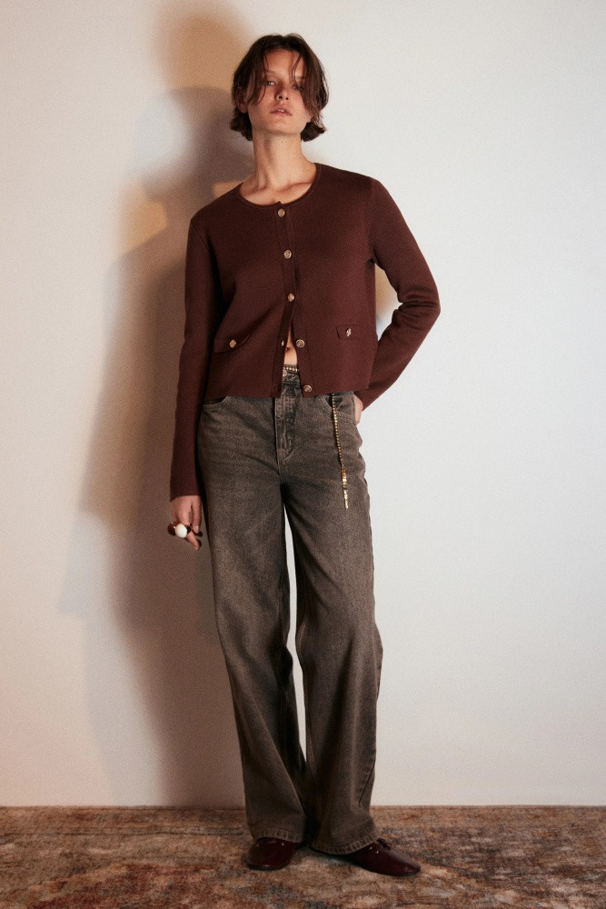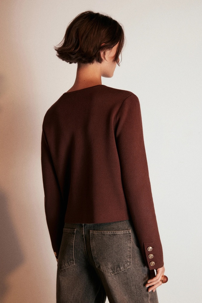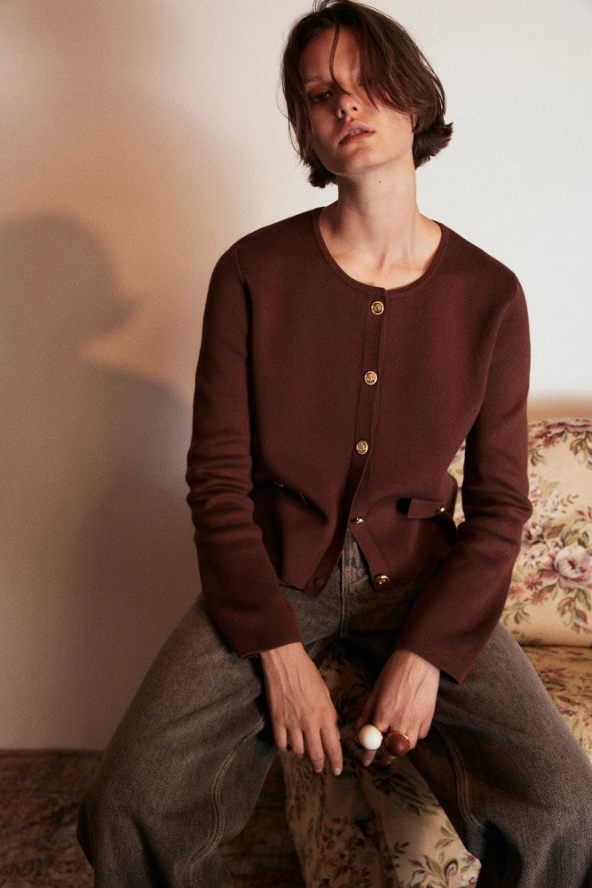 Короткий женский вязаный кардиган свободного кроя из мягкой ткани толстой вязки с жаккардовой фактурой. Круглый вырез горловины без воротника. Длинные свободные рукава с прямыми манжетам и спущенной линией плеча. Застежка на крупные золотистые пуговицы спереди. Имитация карманов с застежкой на пуговицы по бокам. Женственность никогда не покинет тренды, и вещи в стиле французской богемы точно не оставят тебя без внимания. Укороченный вязаный жакет на пуговицах окутает тебя флером Chanel. Носи его отдельно или сочетай с любыми топами или блузками и создавай расслабленные повседневные, школьные, университетские и офисные луки, в которых тебе будет максимально комфортно. Стильный вязаный кардиган-жакет на крупных пуговицах станет основой гардероба и идеально подойдет на любой сезон и любую погоду.