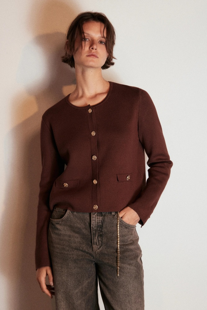 Короткий женский вязаный кардиган свободного кроя из мягкой ткани толстой вязки с жаккардовой фактурой. Круглый вырез горловины без воротника. Длинные свободные рукава с прямыми манжетам и спущенной линией плеча. Застежка на крупные золотистые пуговицы спереди. Имитация карманов с застежкой на пуговицы по бокам. Женственность никогда не покинет тренды, и вещи в стиле французской богемы точно не оставят тебя без внимания. Укороченный вязаный жакет на пуговицах окутает тебя флером Chanel. Носи его отдельно или сочетай с любыми топами или блузками и создавай расслабленные повседневные, школьные, университетские и офисные луки, в которых тебе будет максимально комфортно. Стильный вязаный кардиган-жакет на крупных пуговицах станет основой гардероба и идеально подойдет на любой сезон и любую погоду.
