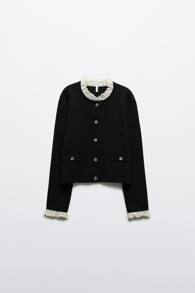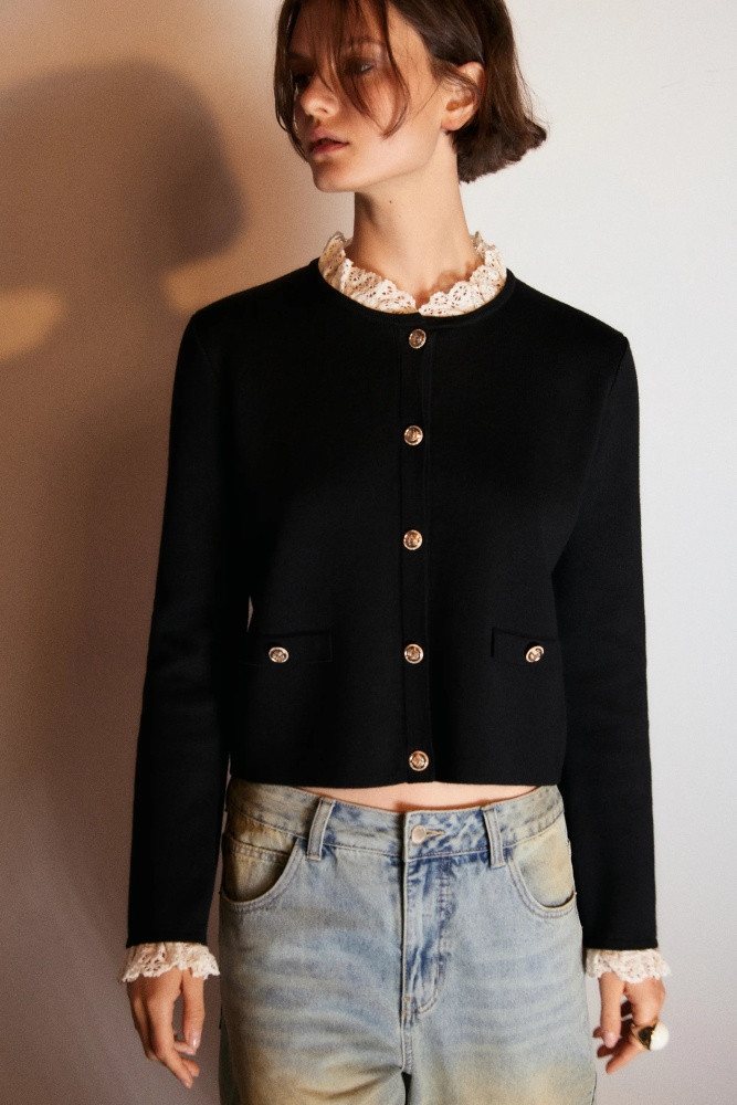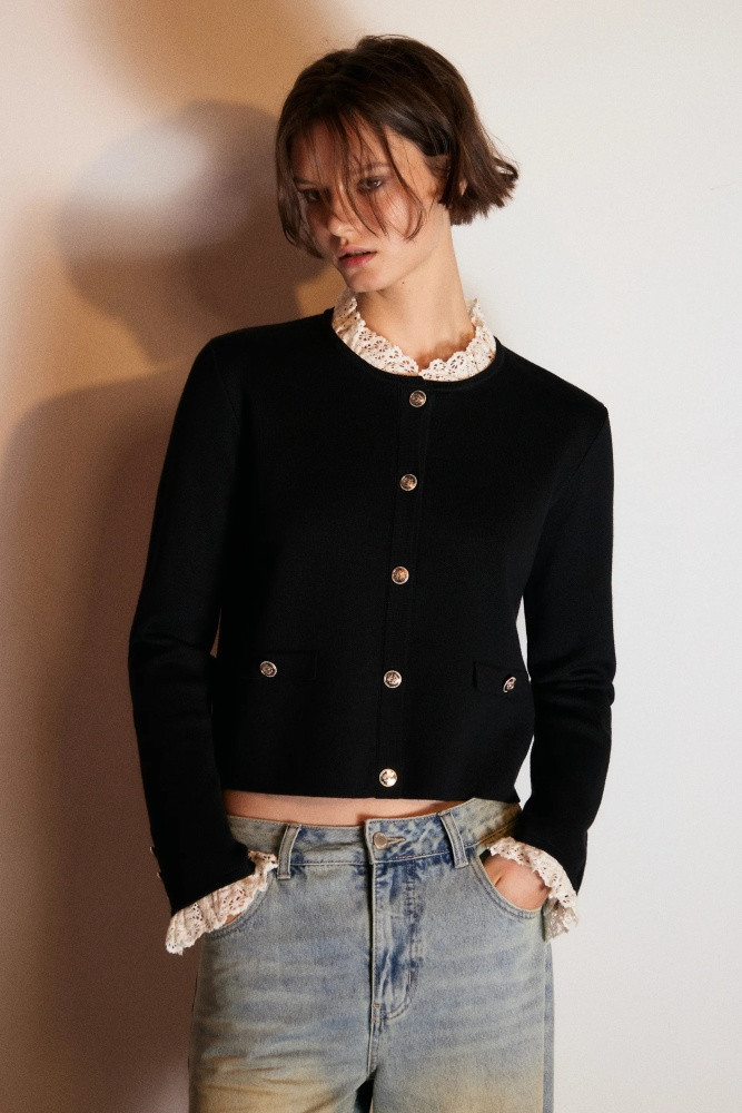 Укороченный женский вязаный кардиган прямого кроя из мягкой, приятной к телу ткани толстой вязки с жаккардовой фактурой. Круглый вырез горловины с кружевным воротничком. Длинные свободные рукава с кружевными манжетами, прямая линия плеча. Застежка на крупные золотистые пуговицы спереди. Имитация карманов с застежкой на пуговицы по бокам. Из трендов никогда не уйдет женственность, а вещи в стиле французской богемы точно не оставят тебя без внимания. Укороченный вязаный жакет на пуговицах окутает тебя флером Chanel. Носи его отдельно или сочетай с любыми топами или блузками и создавай расслабленные повседневные, школьные, университетские и офисные луки, в которых тебе будет максимально комфортно.