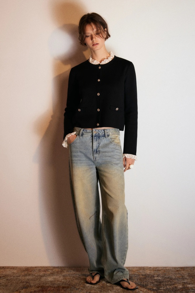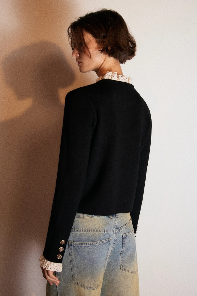 Укороченный женский вязаный кардиган прямого кроя из мягкой, приятной к телу ткани толстой вязки с жаккардовой фактурой. Круглый вырез горловины с кружевным воротничком. Длинные свободные рукава с кружевными манжетами, прямая линия плеча. Застежка на крупные золотистые пуговицы спереди. Имитация карманов с застежкой на пуговицы по бокам. Из трендов никогда не уйдет женственность, а вещи в стиле французской богемы точно не оставят тебя без внимания. Укороченный вязаный жакет на пуговицах окутает тебя флером Chanel. Носи его отдельно или сочетай с любыми топами или блузками и создавай расслабленные повседневные, школьные, университетские и офисные луки, в которых тебе будет максимально комфортно.