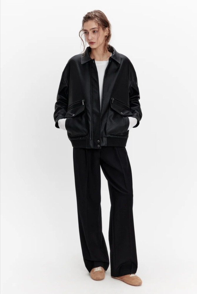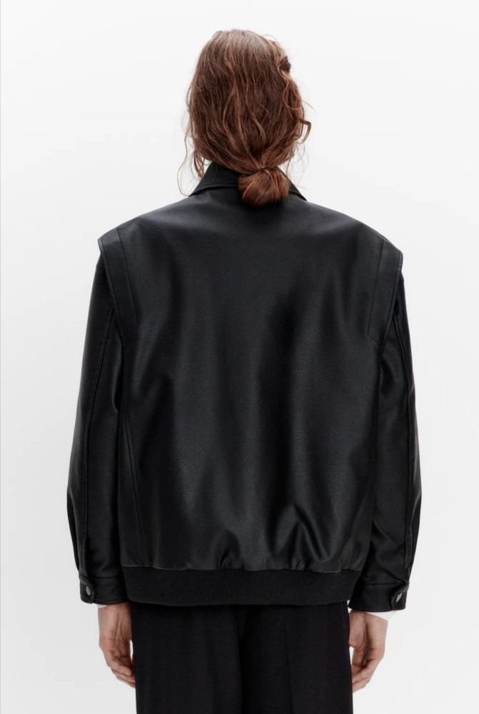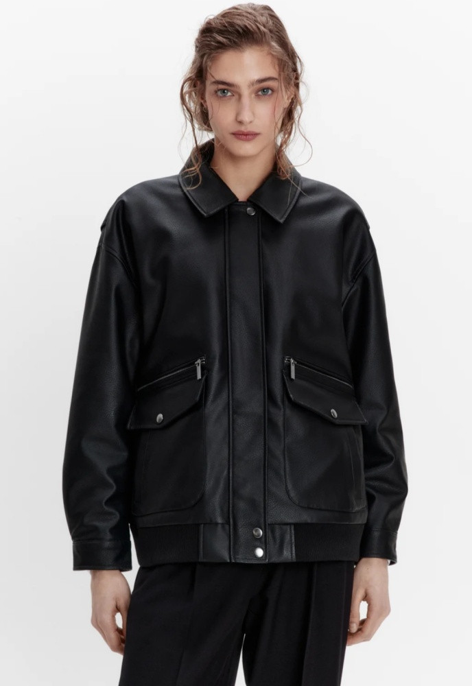 Женская куртка-бомбер свободного кроя из гладкой искусственной кожи с подкладкой и искусственным утеплителем (синтепон). Отложной рубашечный воротник. Длинные свободные рукава с широкими манжетами на кнопках, спущенная линия плеча с имитацией второго слоя на спине. Два боковых накладных кармана с клапанами на кнопке, два боковых прорезных кармана на молнии. Застежка на молнию и планку с кнопками спереди. Нижний край на эластичной резинке без разрезов. Универсальная демисезонная куртка-бомбер с кожаной фактурой и трендовым вареным эффектом спасет тебя от самых неожиданных капризов погоды. Куртка из искусственной кожи добавит дерзости сдержанным образам на учебу или в офис.