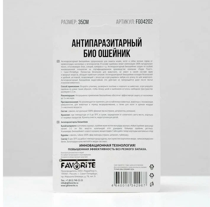 Favorite Ошейник антипаразитарныйВ данный момент этот товар отсутствует в продаже. Возможно, у нас найдется аналогичный или похожий товар здесь. Антипаразитарный ошейник — эффективная защита вашего питомца от блох, клещей и других паразитов. Он обеспечивает продолжительное действие, формируя защитный барьер на протяжении нескольких месяцев. Удобный и безопасный в использовании, ошейник подходит для повседневного ношения, не вызывает раздражения и не мешает животному вести активный образ жизни. Состав: сэвилен, натуральные 100% эфирные масла (герани, цитронеллы, ромашки). |