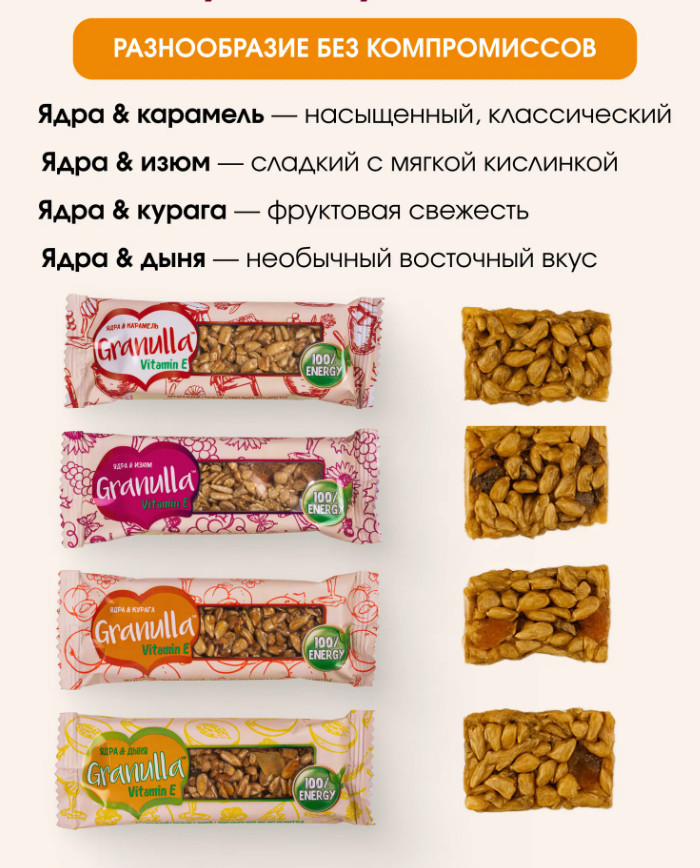 Грильяж без сахара «Granulla» станет замечательным дополнением к вашему утреннему кофе или чаю, а также отличным вариантом для перекуса в перерывах между основными приёмами пищи. Это не просто батончик, это полноценный источник энергии и жизненной силы, который обеспечит заряд бодрости на весь день. Благодаря натуральным ингредиентам, вы можете быть уверены в высоком качестве и безопасности продукта. Показатели целебных свойств орехов и сухофруктов, входящих в состав грильяж, делают его не только вкусным, но и питательным. Он содержит важные элементы, такие как витамины и минералы, которые необходимы для поддержания организма. Так что, если вы ищете здоровую альтернативу сладким батончикам, обратите внимание на этот продукт — он станет вашим верным союзником в мире правильного питания.