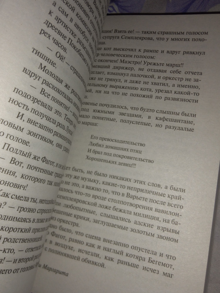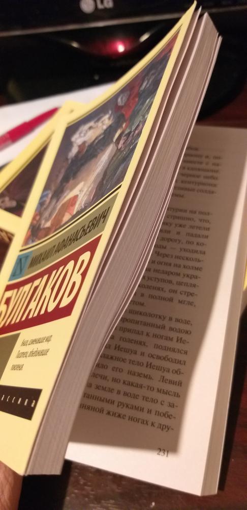 Единственное что не особо нравилось это ершалаимские главы, в остальном очень понравилось просто супер, а про переплет, вообще неоч, бумага так себе, все отслаивается, но все же красивый то какой… еще и картина любимки врубеля…. 😵💫