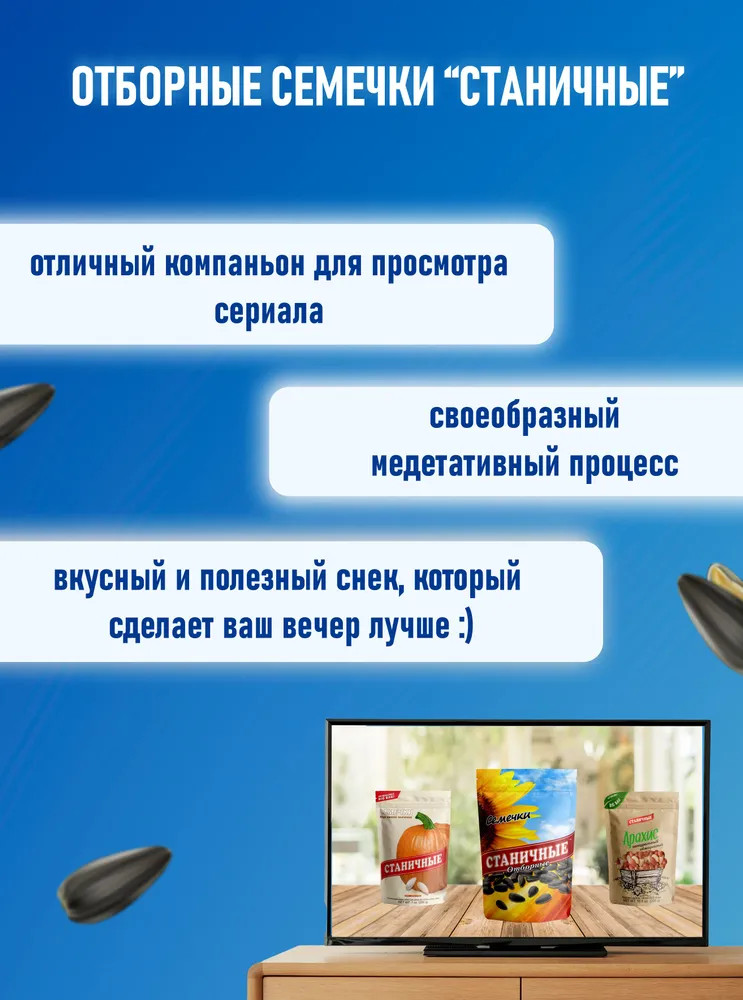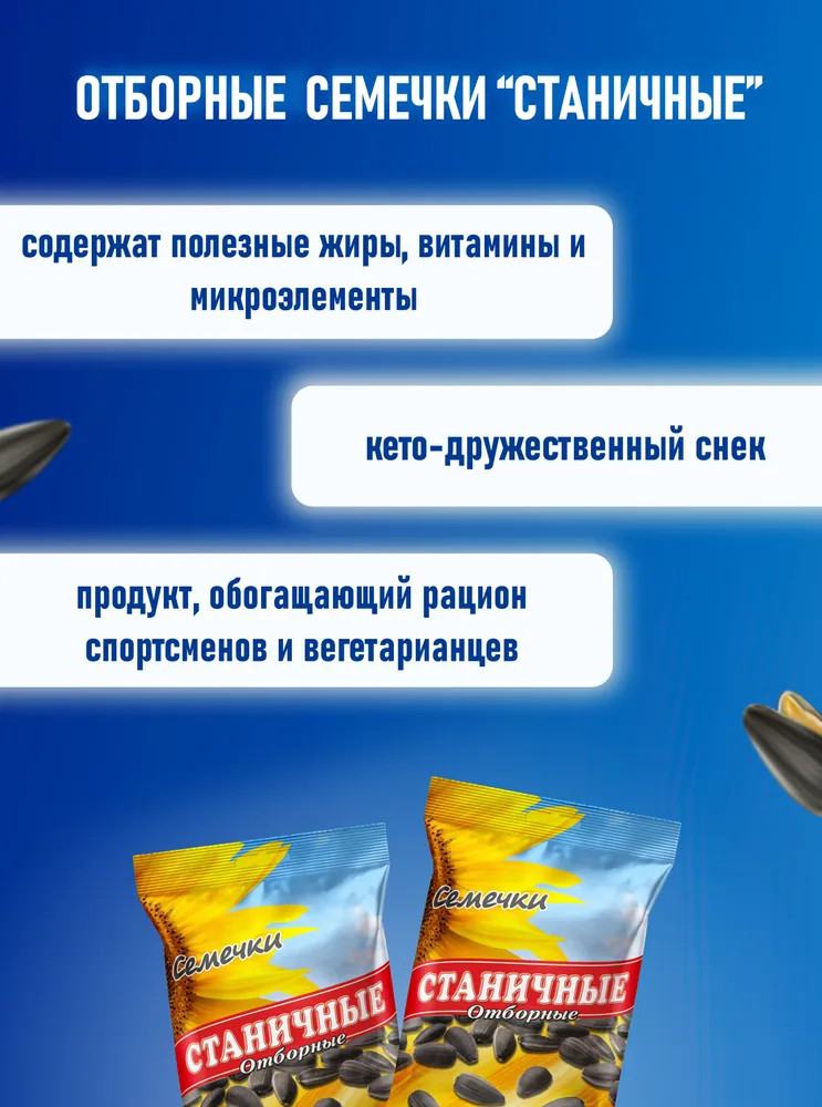 В пачках семечек «Станичные» только крупные семена кондитерских сортов, за счет особой обжарки ядро становится золотистым и хрустящим, а семечки приобретают неповторимый аромат.Тщательный отбор семян, промывка, обжарка без использования масла и многослойная упаковка — всё это помогает сохранить превосходный вкус и полезные свойства семечек.