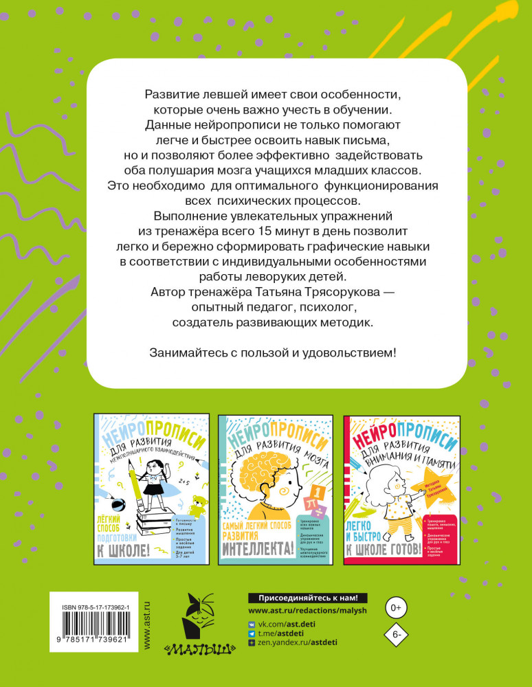 💳 Оплатить за товар можно при получении 🇰🇿 Есть бесплатная доставка по Казахстану от 1 дня 🎁 Копите бонусы с каждой покупки Серия: Нейропрописи Как помочь ребёнку-левше освоить навык письма? Тренажёр Татьяны Трясоруковой, опытного педагога и психолога, содержит три комплекса нейропсихологических упражнений. Они направлены на развитие межполушарных связей, улучшение внимания, памяти, а также формирование графомоторных навыков. Все задания созданы с учётом особенностей работы леворуких детей. В конце пособия также представлены специальные упражнения-переменки, которые помогут ребёнку отдохнуть и настроиться на занятия. Книга подойдёт как для домашних занятий, так и для осуществления развивающей или досуговой деятельности детей в образовательных дошкольных организациях. |