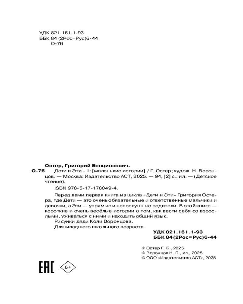 💳 Оплатить за товар можно при получении 🇰🇿 Есть бесплатная доставка по Казахстану от 1 дня 🎁 Копите бонусы с каждой покупки Серия: Детское чтение Перед вами первая книга из цикла «Дети и Эти» Григория Остера, где Дети — это очень обязательные и ответственные мальчики и девочки, а Эти — упрямые и непослушные родители. В этой книге — короткие и очень весёлые истории о том, как вести себя со взрослыми, уживаться с ними и находить общий язык. Рисунки дяди Коли Воронцова. Для младшего школьного возраста. |