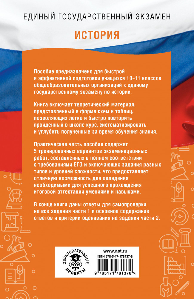 💳 Оплатить за товар можно при получении 🇰🇿 Есть бесплатная доставка по Казахстану от 1 дня 🎁 Копите бонусы с каждой покупки Серия: ЕГЭ на 100 баллов Пособие предназначено для быстрой и эффективной подготовки учащихся 10-11 классов общеобразовательных организаций к единому государственному экзамену по истории. Книга включает теоретический материал, представленный в форме схем и таблиц, позволяющих легко и быстро повторить пройденный в школе курс, систематизировать и углубить полученные за время обучения знания. Практическая часть пособия содержит 5 тренировочных вариантов экзаменационных работ, составленных в полном соответствии с требованиями ЕГЭ и включающих задания разных типов и уровней сложности, что предоставляет отличную возможность для овладения необходимыми для успешного прохождения итоговой аттестации умениями и навыками. В конце книги даны ответы для самопроверки на все задания части 1 и основное содержание ответов и критерии оценивания на задания части 2. |