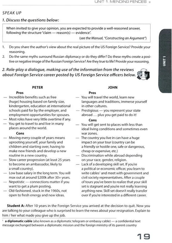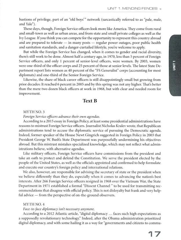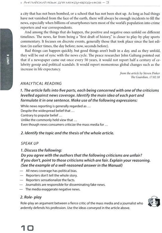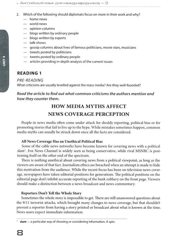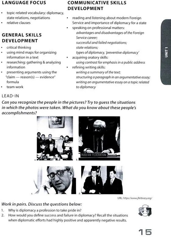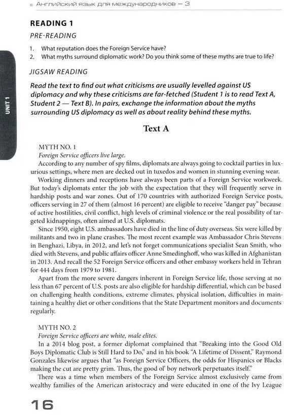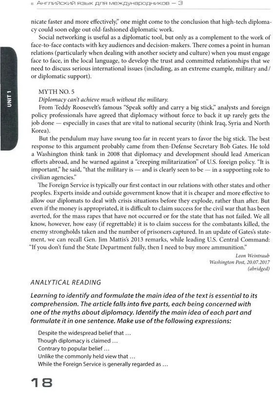 Учебник предназначен для комплексного развития коммуникативной компетенции, необходимой для обучения основам языка профессионального общения в сфере международных отношений, и направлен на развитие всех видов речевой деятельности: чтение, письмо, говорение, слушание. Учебник включает разнообразные задания на правильное словоупотребление, комбинаторику, словообразование, изучение английских фразеологизмов и поиск для них русских эквивалентов, а также коммуникативные задания (в различных формах диалогов, монологов, круглых столов), которые позволяют моделировать профессиональную деятельность специалистов-международников. Развитие профессиональной коммуникативной компетенции осуществляется в рамках таких предметно-лексических тем, как «Профессия дипломата. Задачи дипломатии в современном мире», «Публичные выступления. Язык дипломатии и политики», «Роль лидера в государстве. Лидерство в международных организациях», «Средства массовой информации: освещение новостей. Роль СМИ в международных отношениях», «Международные отношения и проблемы информационной безопасности». Для студентов бакалавриата факультета международных отношений МГИМО МИД России, обучающихся по направлениям «Международные отношения» и «Зарубежное регионоведение».
