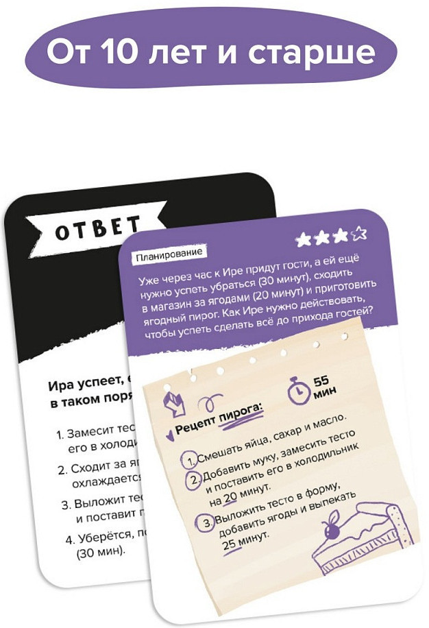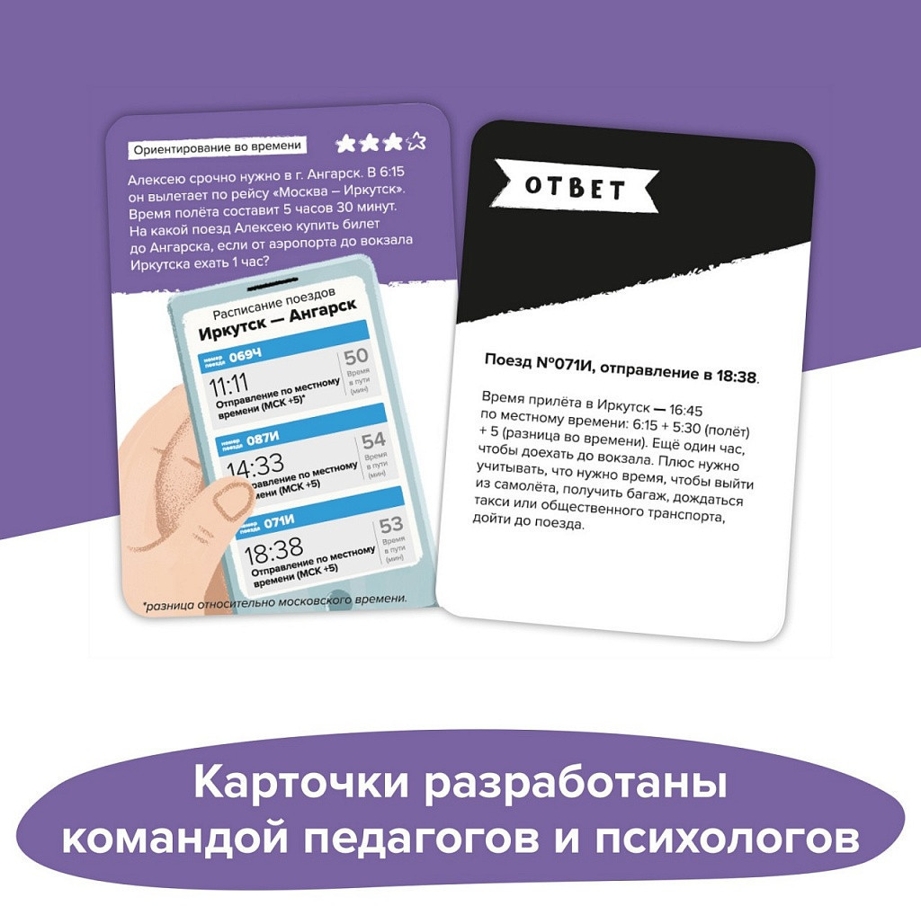 В наборе 80 обучающих карточек: 13 карт с эффективными техниками управления временем и 67 карт с заданиями. У каждого задания указан уровень сложности и основная компетенция, которую развивает данный тип задач. На обороте карты — ответ с пояснением решения.