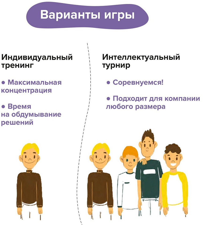 Занимайтесь с ребёнком индивидуально или устройте интеллектуальный турнир! Индивидуальный тренинг позволяет ребёнку максимально сконцентрироваться на задании и даёт время обдумать решение. Это базовый вариант игры, при котором мы советуем давать ребёнку не больше 5 карт с заданиями разной сложности и направленности, чтобы ему всегда хотелось ещё. При таком варианте, хорошо выбрать несколько дней в неделю для регулярных занятий. Интеллектуальный турнир — это соревновательный вариант игры для компании любого размера. Разделите группу детей на команды из 2-5 человек и устройте соревнование!