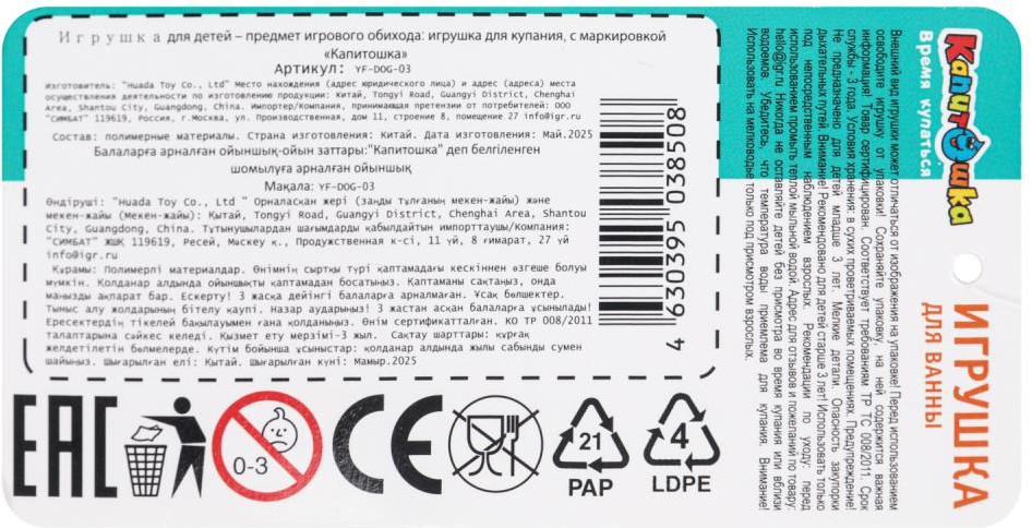 💳 Оплатить за товар можно при получении 🇰🇿 Есть бесплатная доставка по Казахстану от 1 дня 🎁 Копите бонусы с каждой покупки Игрушка для ванны «Собачка» ТМ «Капитошка» — отличный вариант для игр в воде. Эта фигурка в виде забавного щенка непременно понравится малышу и превратит купание в увлекательную игру. С такой игрушкой ребёнок сможет придумать и разыграть множество интересных сюжетов. Милая пластизолевая фигурка поспособствует приучению малыша к водным процедурам и будет поддерживать дальнейший интерес к ним. Игра с фигуркой для ванны ТМ «Капитошка» развивает: фантазию, воображение, моторику, внимание, речь и мышление. |