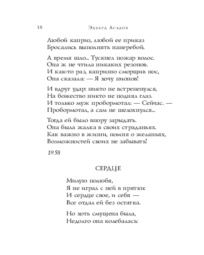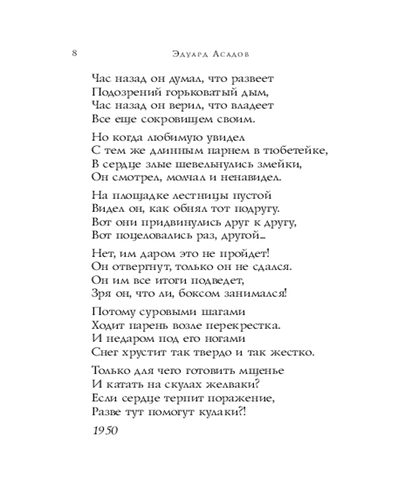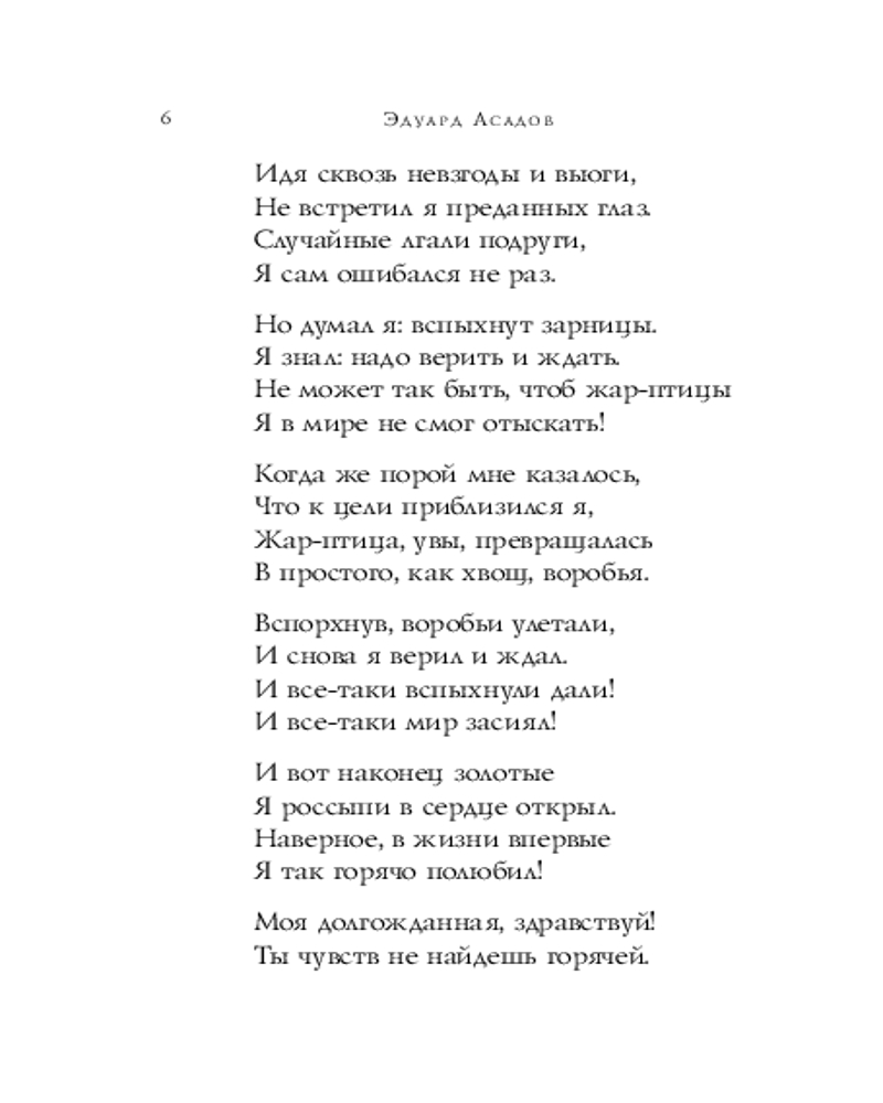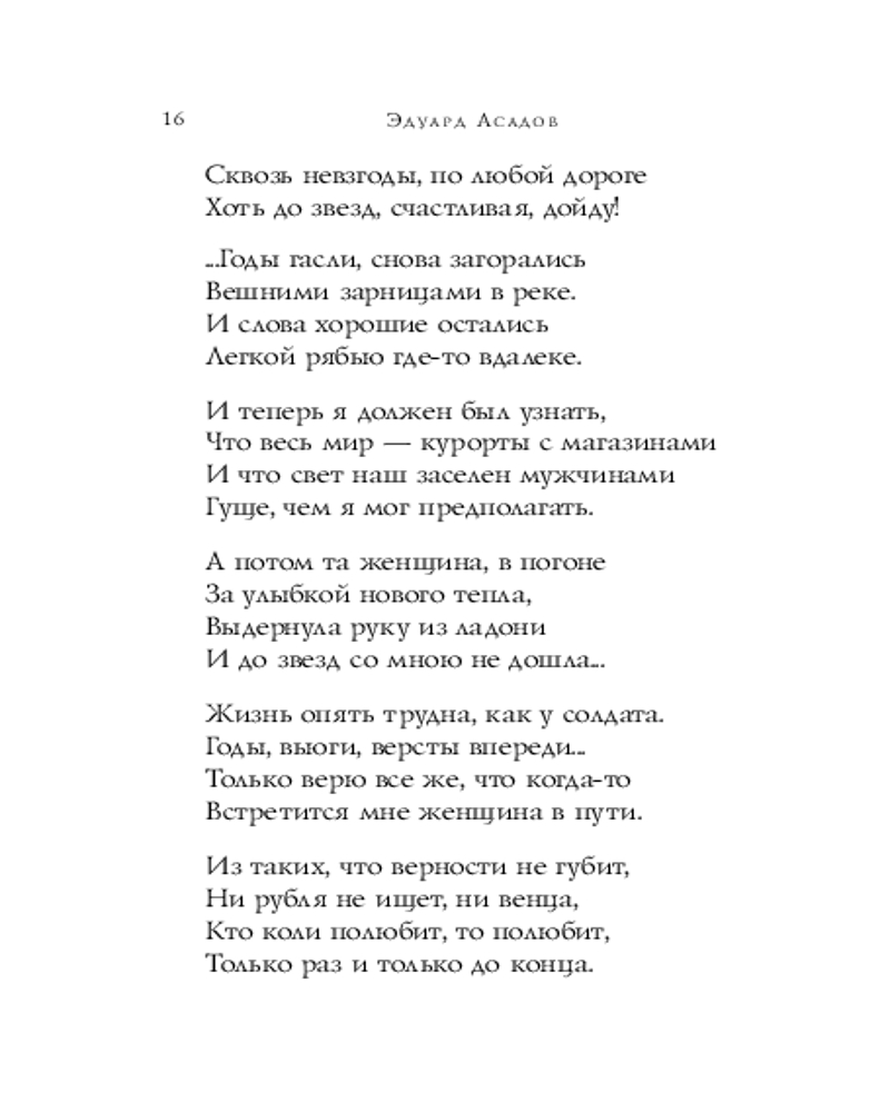 💳 Оплатить за товар можно при получении 🇰🇿 Есть бесплатная доставка по Казахстану от 1 дня 🎁 Копите бонусы с каждой покупки Серия: Собрание больших поэтов Эдуард Асадов (1923-2004) — один из самых читаемых советских поэтов-лириков. Многие начинавшие писать стихи делали это «по Асадову», ведь он умел говорить с людьми на языке привычном и понятном им и очень хорошо представлял себе своего читателя: действительно наивного, не всегда умеющего выразить свои чувства и изложить мысли, но искреннего. Потому-то стихи Эдуарда Асадова в основном сюжетны: в их основе истории, которые любой неискушённый человек может счесть своими собственными. |