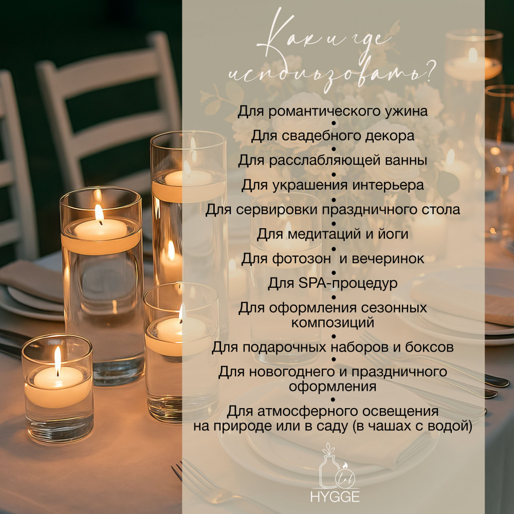 Создайте волшебную обстановку с помощью плавающих свечей, которые горят до 5 часов. Они идеально подойдут для романтического ужина, расслабляющей ванны, праздничного декора или фотозоны. Главное — следить за безопасностью и не оставлять свечи без присмотра. |