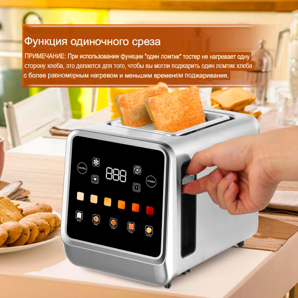 One Slice Function Toaster. Эта инновационная функция гарантирует, что даже когда вы поджариваете всего один ломтик хлеба, оба слота тостера нагреваются одновременно. Такая конструкция предотвращает неравномерный нагрев, обеспечивая каждый раз идеально поджаренный хлеб. Активируя оба слота, можно ускорить поджаривание, что делает приготовление завтрака более эффективным. Наслаждайтесь равномерно нагретыми и вкусными тостами за меньшее время с помощью функции One Slice. Подходит для различных типов хлеба не только функции отмены, размораживания, повторного нагрева, мы также специально добавили функции типа хлеба, включая бублик, белый, вафли, eng.muffin, без глютена, зерно.