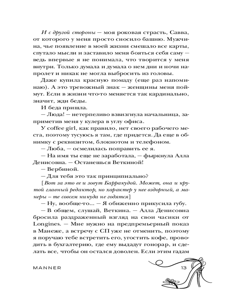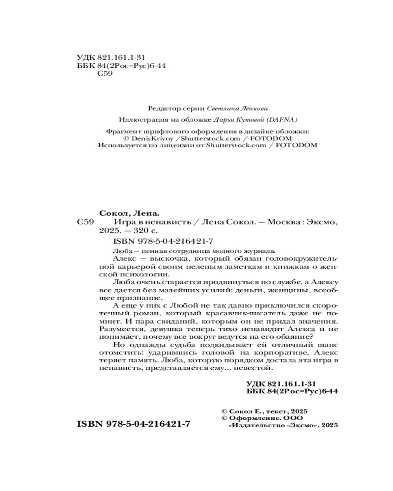 💳 Оплатить за товар можно при получении 🇰🇿 Есть бесплатная доставка по Казахстану от 1 дня 🎁 Копите бонусы с каждой покупки Серия: New Adult. Романтика Лены Сокол (покет с клапанами) Люба — ценная сотрудница модного журнала. Алекс — выскочка, который обязан головокружительной карьерой своим нелепым заметкам и книжкам о женской психологии. Люба очень старается продвинуться по службе, а Алексу всё даётся без малейших усилий: деньги, женщины, всеобщее признание. А ещё у них с Любой не так давно приключился скоротечный роман, который красавчик-писатель даже не помнит. И пара свиданий, которым он не придал значения. Разумеется, девушка теперь тихо ненавидит Алекса и не понимает, почему все вокруг ведутся на его обаяние? Но однажды судьба подкидывает ей отличный шанс отомстить: ударившись головой на корпоративе, Алекс теряет память. Люба, которую порядком достала эта игра в ненависть, представляется ему... невестой. |