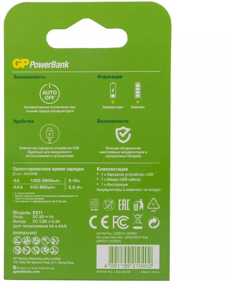 💳 Оплатить за товар можно при получении 🇰🇿 Есть бесплатная доставка по Казахстану от 1 дня 🎁 Копите бонусы с каждой покупки Универсальное зарядное устройство GP PowerBank E211-2CRB1 на 2 слота способно заряжать одновременно 2 аккумулятора и работать с двумя самыми распространёнными форматами батарей — «пальцами» (AA) и «мизинцами» (AAA). Таким образом ваша техника, электронные устройства, игрушки, гаджеты никогда не останутся без энергии. Особенности. Удобство эксплуатации. Лёгкость и компактный размер зарядного устройства позволяет использовать его повсеместно — дома, в офисе, брать с собой в поездки. Устройство легко поместится в любую сумку и бардачок машины. |